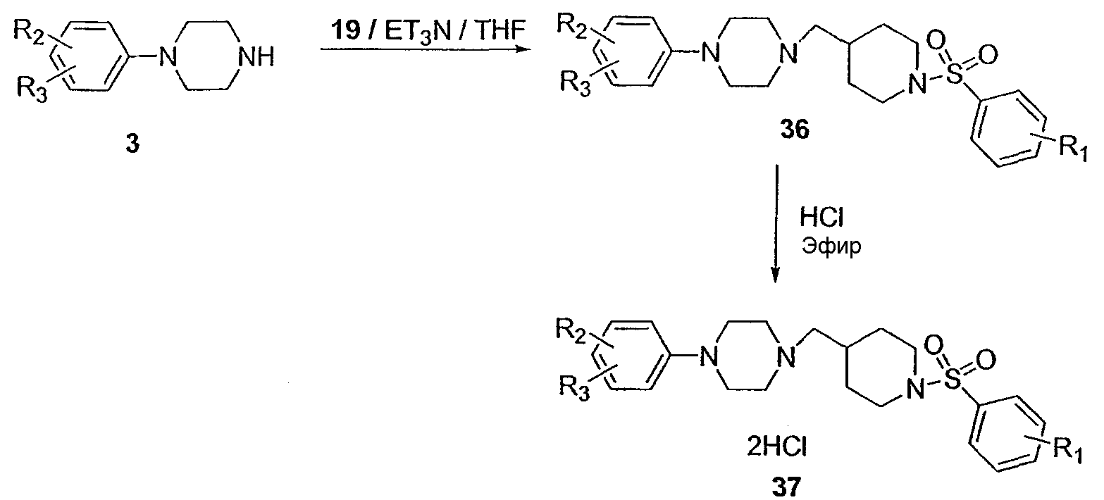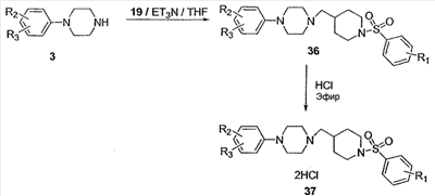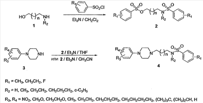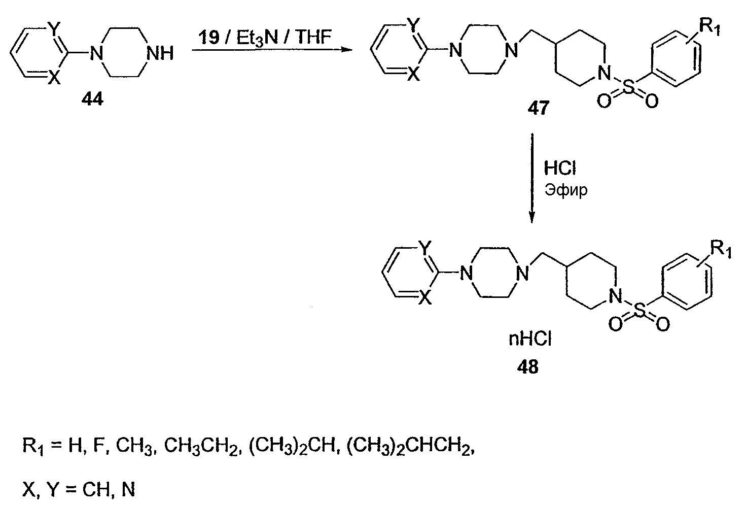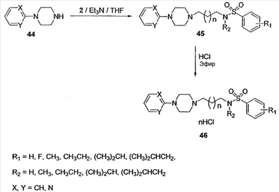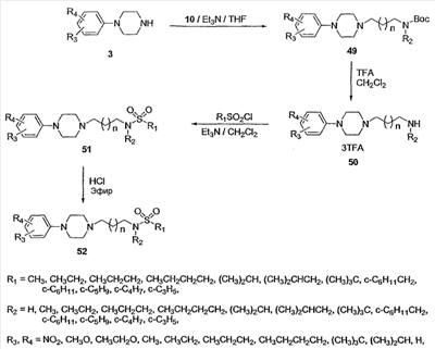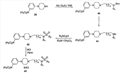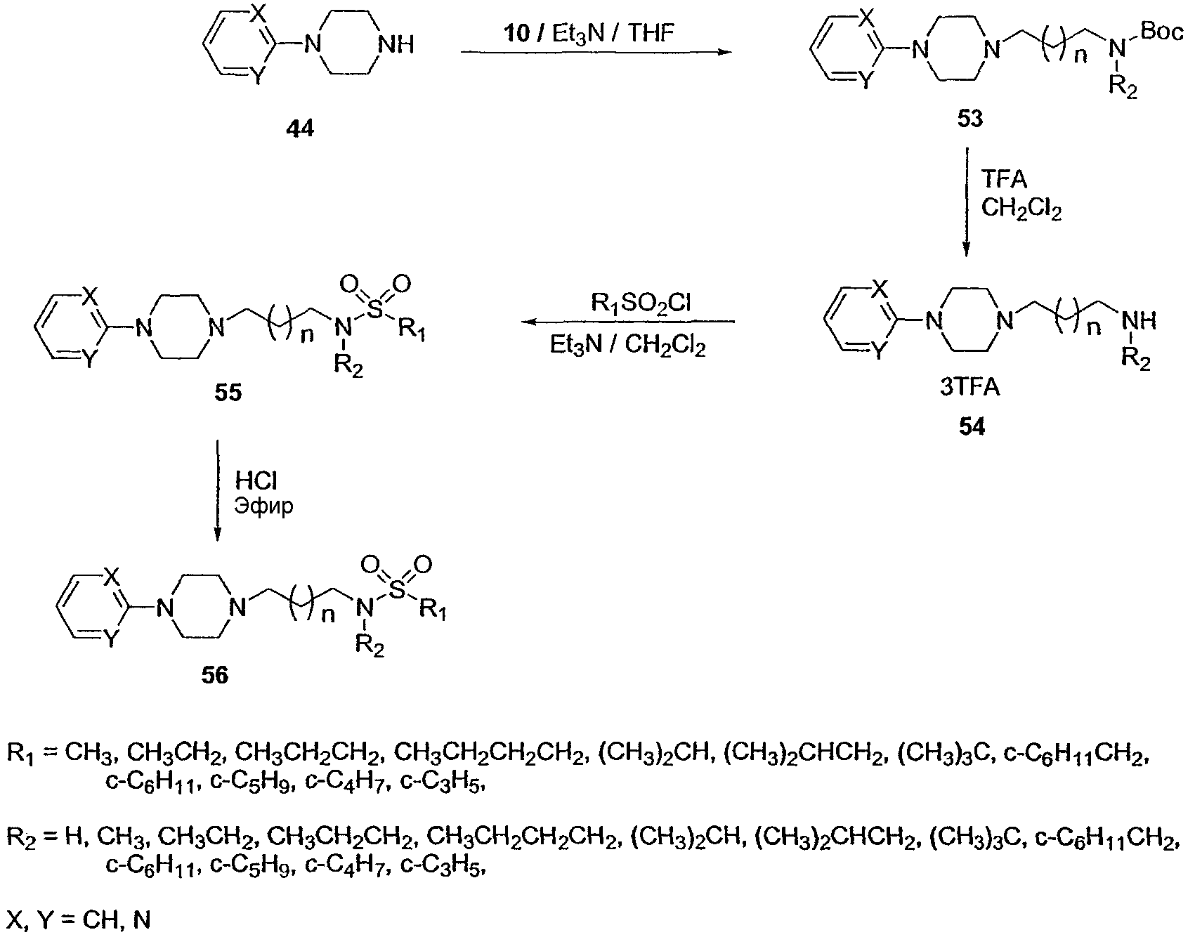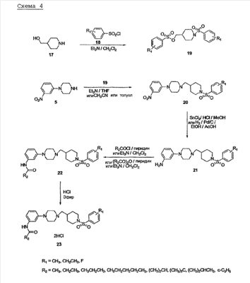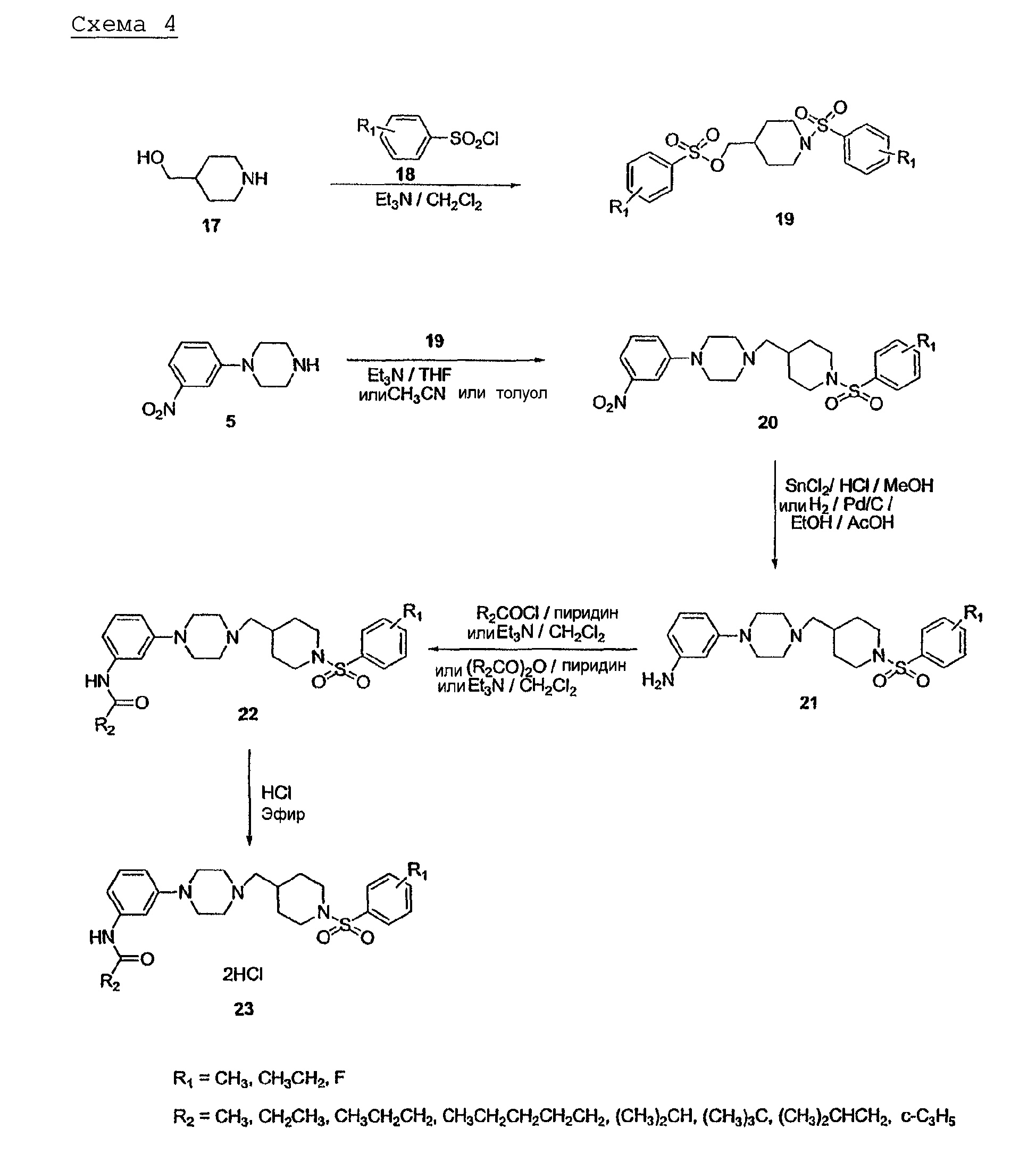 В конкретных вариантах, соединениями настоящего изобретения являются 4-метил-N-{4-[4-(3-нитрофенил)пиперазин-1-ил]бутил}-бензолсульфонамид; HCl-соль 4-метил-N-{4-[4-(3-нитрофенил)пиперазин-1-ил]бутил}-бензолсульфонамида; (3-{4-[4-(толуол-4-сульфониламино)бутил]пиперазин-1-ил}фенил)амид циклопропанкарбоновой кислоты; N-(3-{4-[4-(толуол-4-сульфониламино)бутил]пиперазин-1-ил}фенил)бутирамид; 2,2-диметил-N-(3-{4-[4-(толуол-4-сульфониламино)бутил]пиперазин-1-ил}фенил)пропионамид; N-(3-{4-[4-(толуол-4-сульфониламино)бутил]пиперазин-1-ил}фенил)изобутирамид; N-{4-[4-(3-этансульфониламинофенил)пиперазин-1-ил]бутил}-4-метилбензолсульфонамид; 4-метил-N-(4-{4-[3-(пропан-2-сульфониламино)фенил]пиперазин-1-ил}бутил)бензолсульфонамид; 4-метил-N-{4-[4-(3-нитрофенил)пиперазин-1-ил]бутил}-бензолсульфонамид; 4-метил-N-[4-(4-пиридин-2-ил-пиперазин-1-ил)-бутил]бензолсульфонамид; N-{4-[4-(2-метокси-5-нитрофенил)пиперазин-1-ил]бутил}-4-метилбензолсульфонамид; 4-метил-N-[4-(4-пиримидин-2-илпиперазин-1-ил)бутил]-бензолсульфонамид; N-{4-[4-(3-метоксифенил)пиперазин-1-ил]бутил}-4-метилбензолсульфонамид; N-{4-[4-(3-этансульфониламинофенил)пиперазин-1-ил]бутил}-4-метилбензолсульфонамид; N-{4-[4-(3-метансульфониламинофенил)-пиперазин-1-ил]бутил}-4-метилбензолсульфонамид; 4-метил-N-{4-[4-(3-пиразин-2-илфенил)пиперазин-1-ил]бутил}бензолсульфонамид; N-[4-(4-бифенил-3-илпиперазин-1-ил)бутил]-4-метилбензолсульфонамид; 4-метил-N-[4-(4-фенилпиперазин-1-ил)бутил]бензолсульфонамид; С-циклогексил-N-{4-[4-(2-метоксифенил)пиперазин-1-ил]бутил}метансульфонамид; N-(3-{4-[4-(толуол-4-сульфониламино)бутил]пиперазин-1-ил}фенил)ацетамид; N-(3-{4-[4-(толуол-4-сульфониламино)бутил]пиперазин-1-ил}фенил)пропионамид; (3-{4-[1-(4-фтор-бензолсульфонил)пиперидин-4-илметил]пиперазин-1-ил}фенил)диметиламин; 1-[1-(4-фторбензолсульфонил)пиперидин-4-илметил]-4-пиридин-2-илпиперазин; С-циклогексил-N-{4-[4-(3-диметиламинофенил)пиперазин-1-ил]бутил}метансульфонамид; С-циклогексил-N-[4-(4-пиридин-2-илпиперазин-1-ил)бутил]-метансульфонамид; N-(3-{4-[1-(4-фторбензолсульфонил)пиперидин-4-илметил]пиперазин-1-ил}фенил)ацетамид; N-(3-{4-[4-(4-фторбензолсульфониламино)бутил]пиперазин-1-ил}фенил)ацетамид; N-{3-[4-(4-циклогексилметансульфониламинобутил)пиперазин-1-ил]фенил}ацетамид; N-{3-[4-(1-циклогексилметансульфонил-пиперидин-4-илметил)пиперазин-1-ил]фенил}ацетамид; {3-[4-(4-циклогексилметансульфониламинобутил)пиперазин-1-ил]фенил}амид циклопропанкарбоновой кислоты, N-(3-{4-[1-(пропан-2-сульфонил)пиперидин-4-илметил]пиперазин-1-ил}фенил)ацетамид; N-(3-{4-[4-(пропан-2-сульфониламино)бутил]пиперазин-1-ил}фенил)ацетамид; N-{3-[4-(4-циклогексансульфониламинобутил)-пиперазин-1-ил]фенил}ацетамид; N-(3-{4-[4-(циклогексилметансульфонилметиламино)бутил]пиперазин-1-ил}фенил)ацетамид; N-(3-{4-[4-(2-метилпропан-1-сульфониламино)-бутил]пиперазин-1-ил}фенил)ацетамид; N-[3-(4-{4-[метил-(2-метилпропан-1-сульфонил)амино]бутил}пиперазин-1-ил)фенил]-ацетамид; N-(3-пиперазин-1-илфенил)ацетамид, (3-пиперазин-1-илфенил)амид циклопропанкарбоновой кислоты и 1-(2-метоксифенил)-4-[1-(толуол-4-сульфонил)пиперидин-3-илметил]пиперазин.
