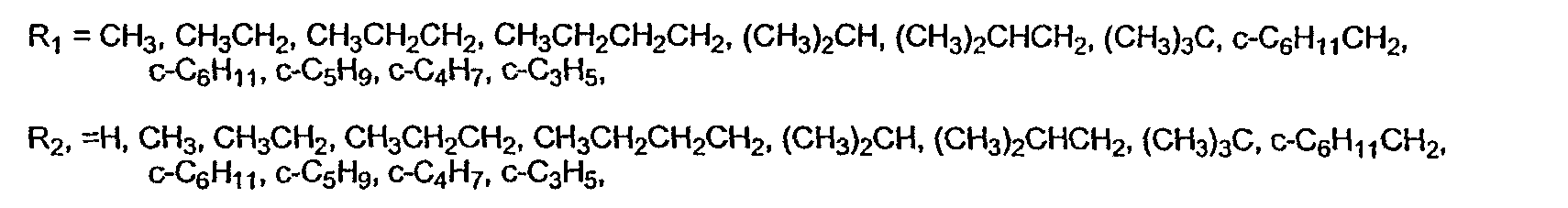 В одном из вариантов настоящего изобретения R1 может представлять собой низший алкил, например н-бутил, втор-бутил, изобутил; п-толуол, п-галогенфенил (например, п-фторфенил, п-хлорфенил или п-бромфенил), циклоалкил, например циклопропил, циклобутил, циклопентил, циклогексил, циклогексилметил и циклогексилфенил. В одной из версий этого варианта изобретения, R2 может представлять собой аминоалкил, например амино(низший)алкил, такой как аминометил, аминоэтил, аминопропил, аминоциклопропил, аминобутил или диалкиламино. В другой версии R2 может представлять собой NHCO-алкил, например NHCO-(С2-С4)алкил, включая NHCO-(СН3), NHCO-(СН2СН3), NHCO-(СН2СН2-СН3) и NHCO-(СН(СН2)2) (т.е. NHCO-циклопропил).