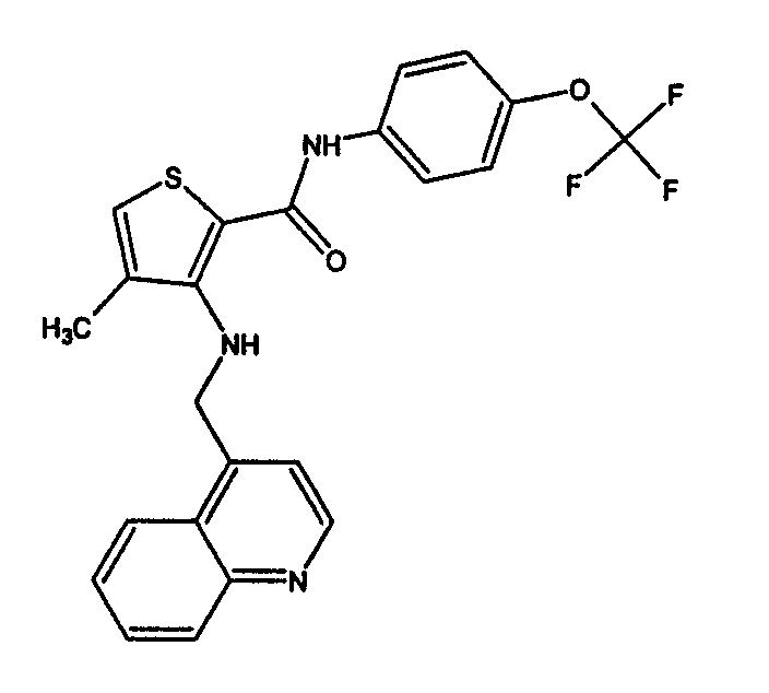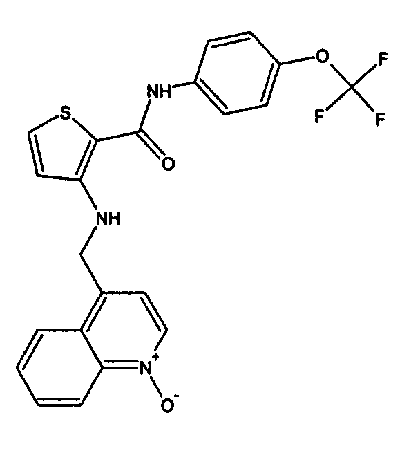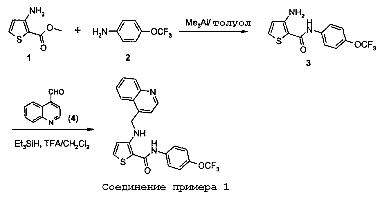 Раствор 1-оксида хинолин-4-карбоксальдегида (0,12 г, 0,69 ммоль), 3-амино-N-[4-(трифторметокси)фенил]тиофен-2-карбоксамида (0,21 г, 0,69 ммоль), дихлорметана (2 мл) и трифторуксусной кислоты (2 мл) нагревают при 50оС в течение 2 часов, затем охлаждают до комнатной температуры, обрабатывают триэтисиланом (0,22 мл, 1,38 ммоль) и перемешивают при 50оС в течение еще 2 часов. После этого времени смесь разбавляют водой (40 мл), подщелачивают (рН 9) 2М водным раствором NaOH и экстрагируют этилацетатом (3×20 мл). Экстракты промывают водой (30 мл) и насыщенным раствором соли (30 мл), затем сушат (MgSO4) и концентрируют в вакууме, получая неочищенный продукт. Данный продукт хроматографируют на силикагеле, элюируя смесью 15% ацетонитрил/CH2Cl2, и затем выделенное вещество очищают кристаллизацией из ацетонитрила, получая 3-{[(1-оксидохинолин-4-ил)метил]амино}-N-[4-(трифторметокси)фенил]тиофен-2-карбоксамид. МС (ES+): 460 [MH+].