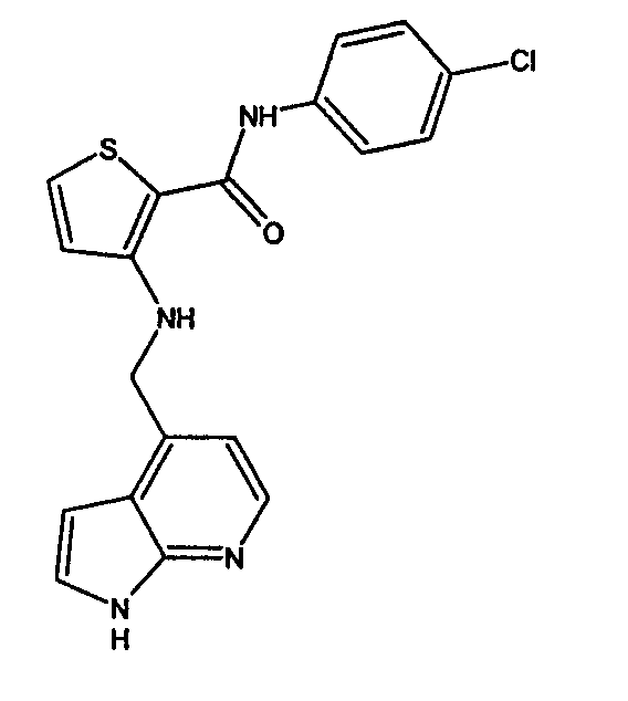 N-(4-хлорфенил)-3-[(1Н-пирроло[2,3-b]пиридин-3-илметил)амино]тиофен-2-карбоксамид: получают в соответствии с методикой, описанной выше для примера 5, используя N-(4-хлорфенил)-3-аминотиофен-2-карбоксамид (полученный, как описано в примере 1, часть 1, используя 4-хлоранилин вместо 4-трифторметоксианилина) и 7-азаиндолил-3-карбоксальдегид (пример 8, часть 1) вместо 2-(N-метилкарбамоил)пиридин-4-карбоксальдегида. МС(ES+): 383, 385 [MH+].