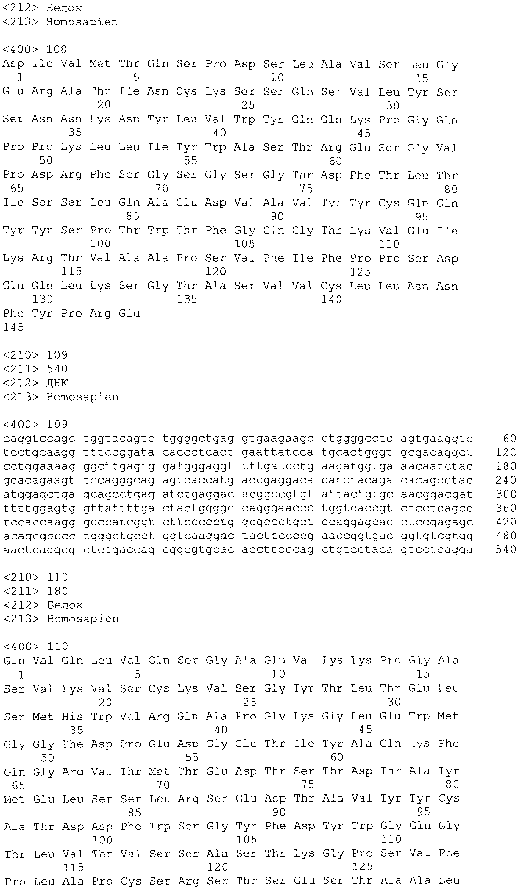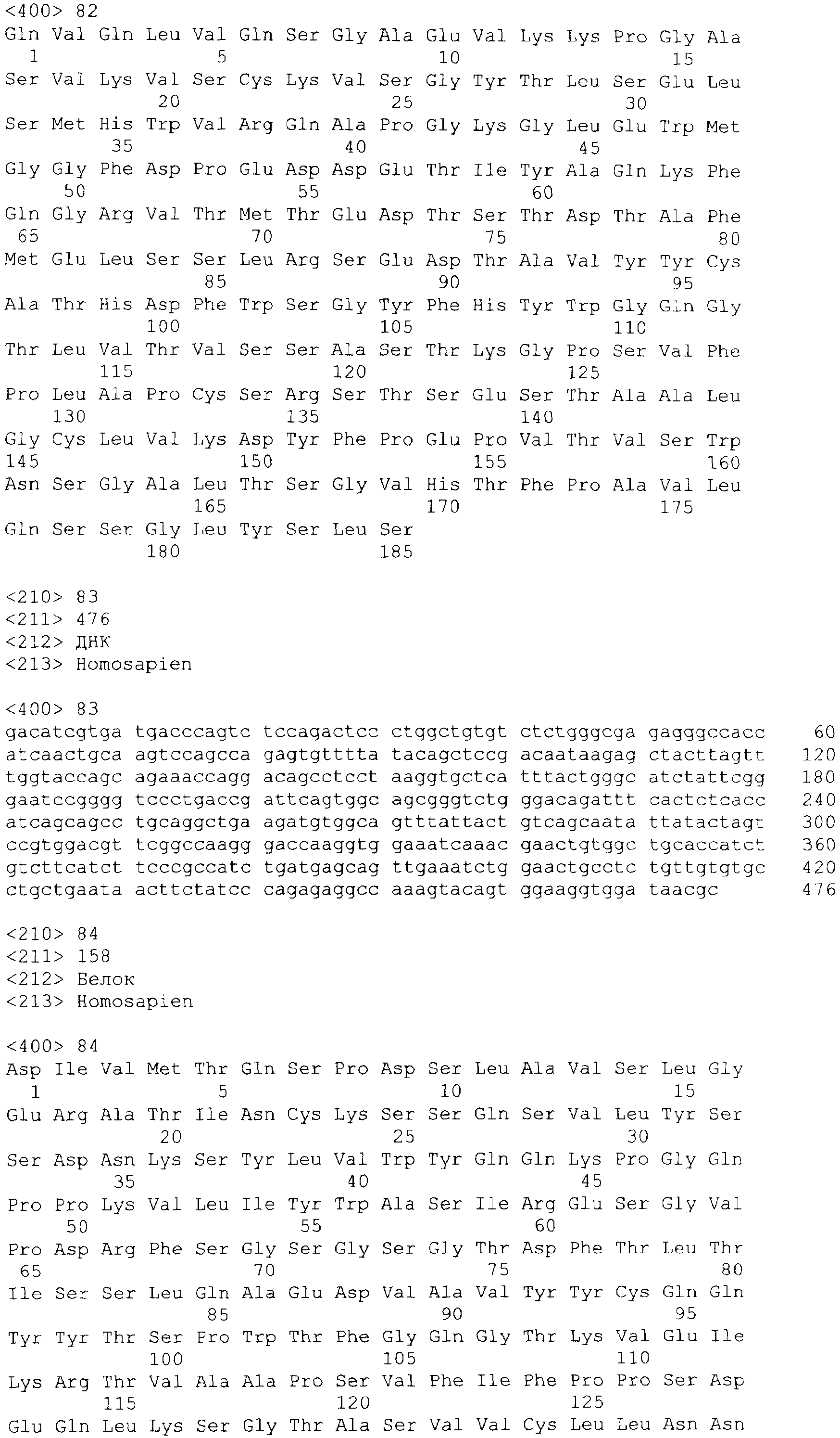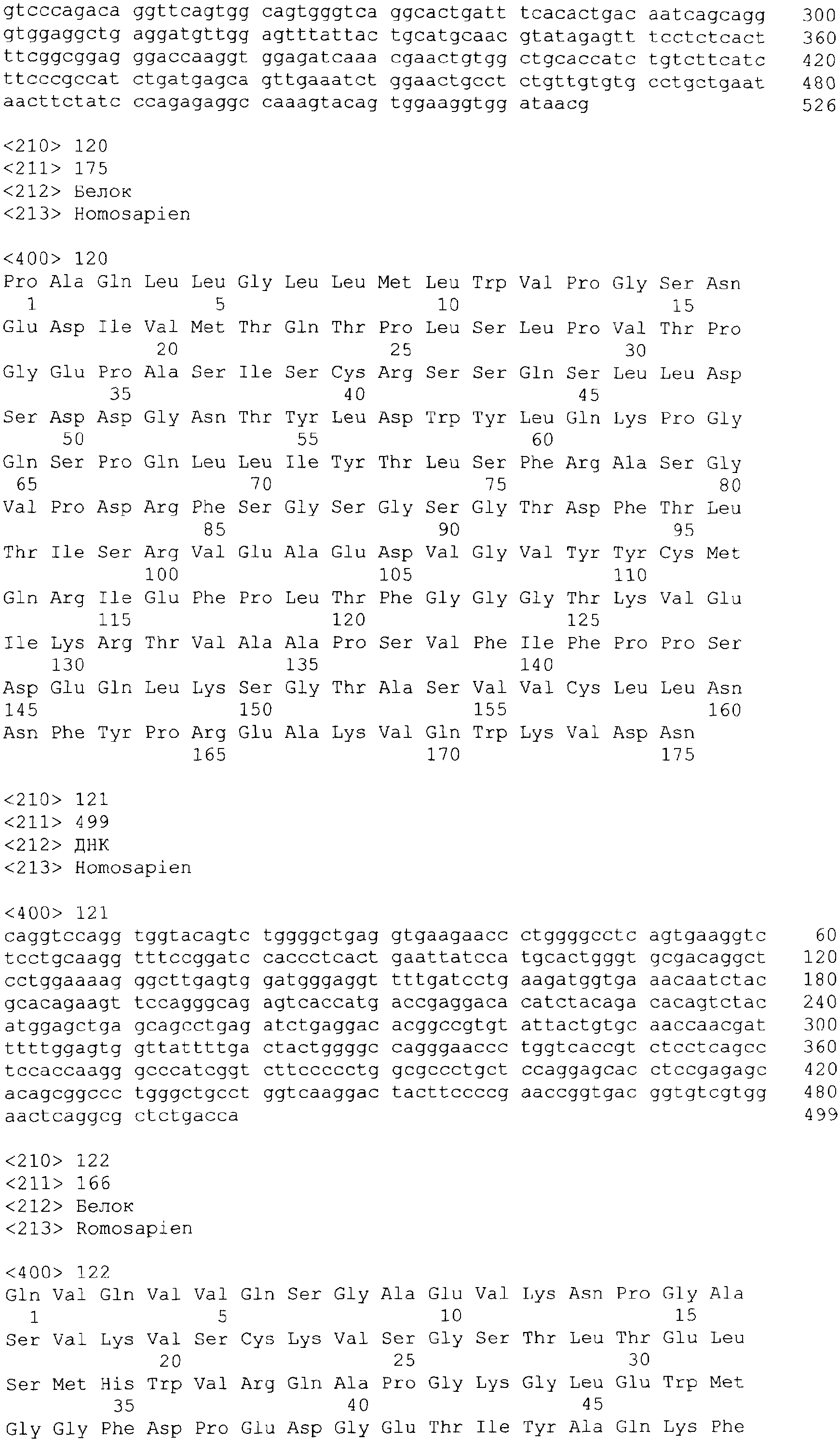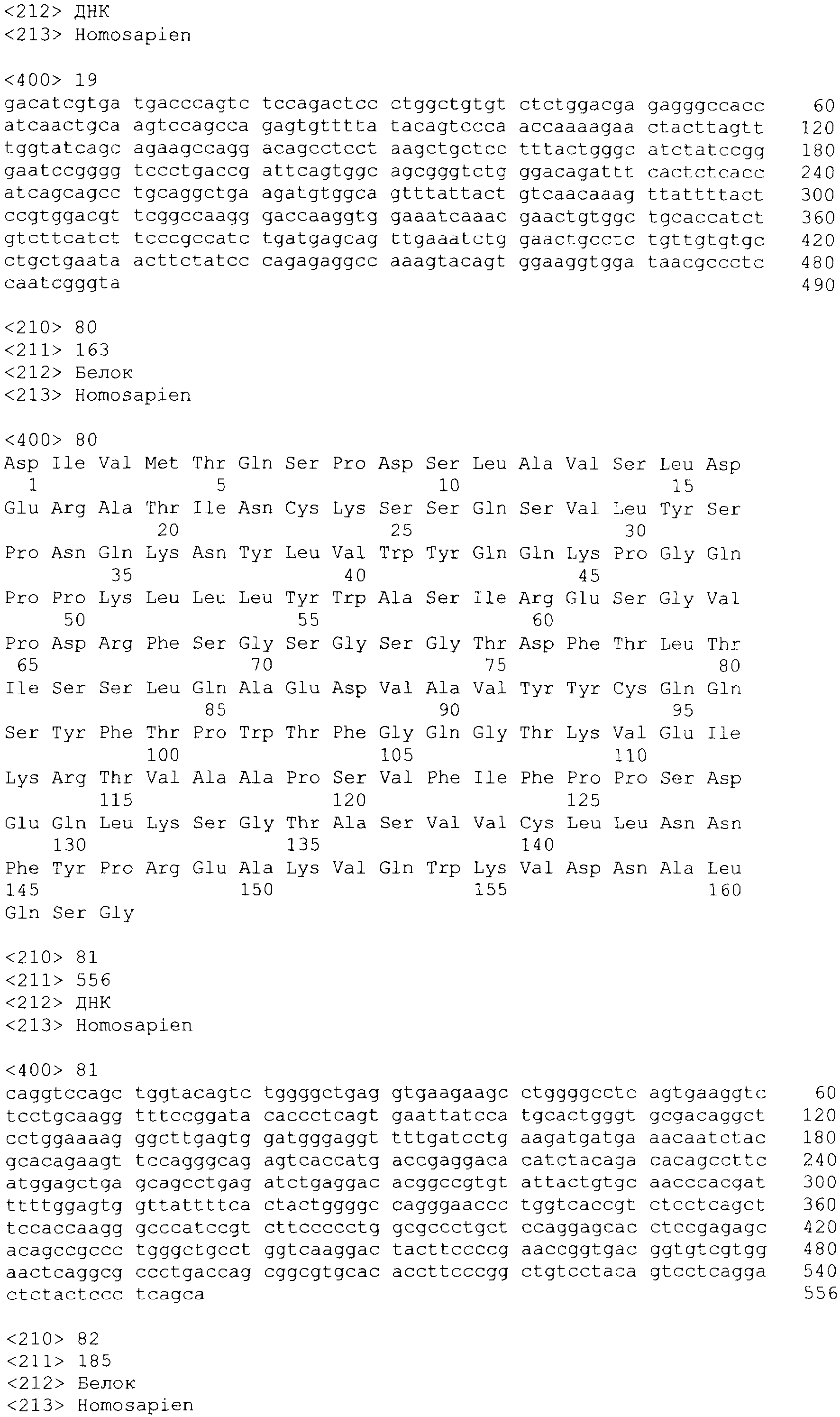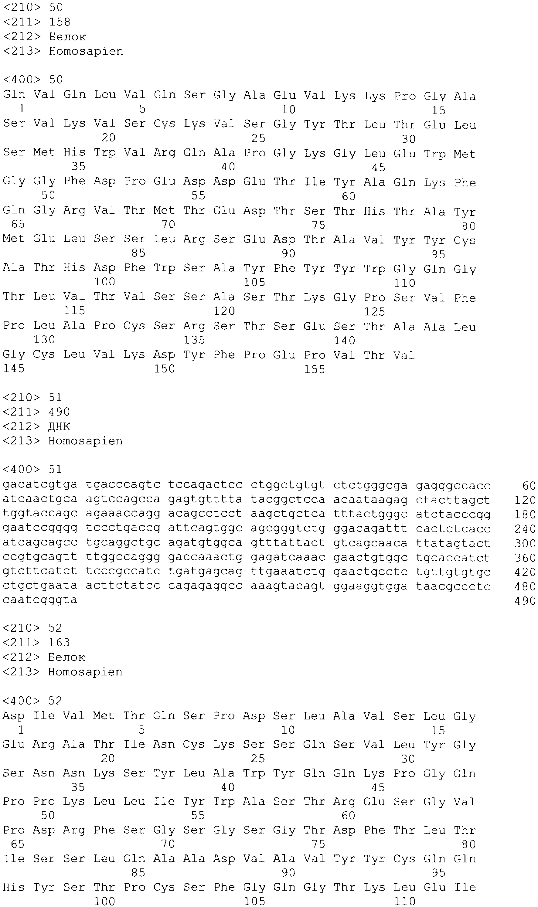 Нуклеотидные и аминокислотные последовательности вариабельной области тяжелой и легкой цепей репрезентативных человеческих анти-МСР-1 антител приводятся в нижеследующем систематизированном списке последовательностей, представленном в таблице 1.