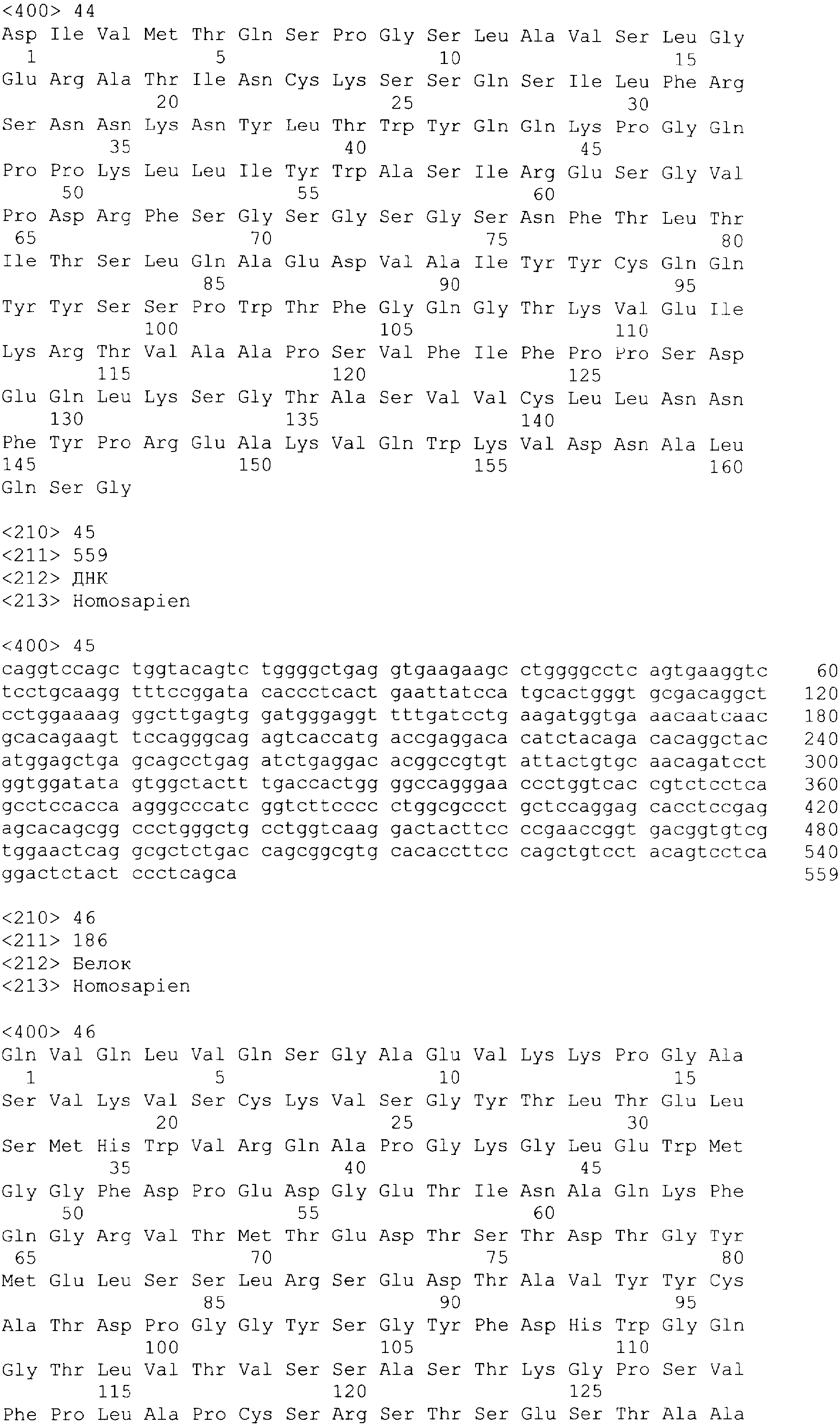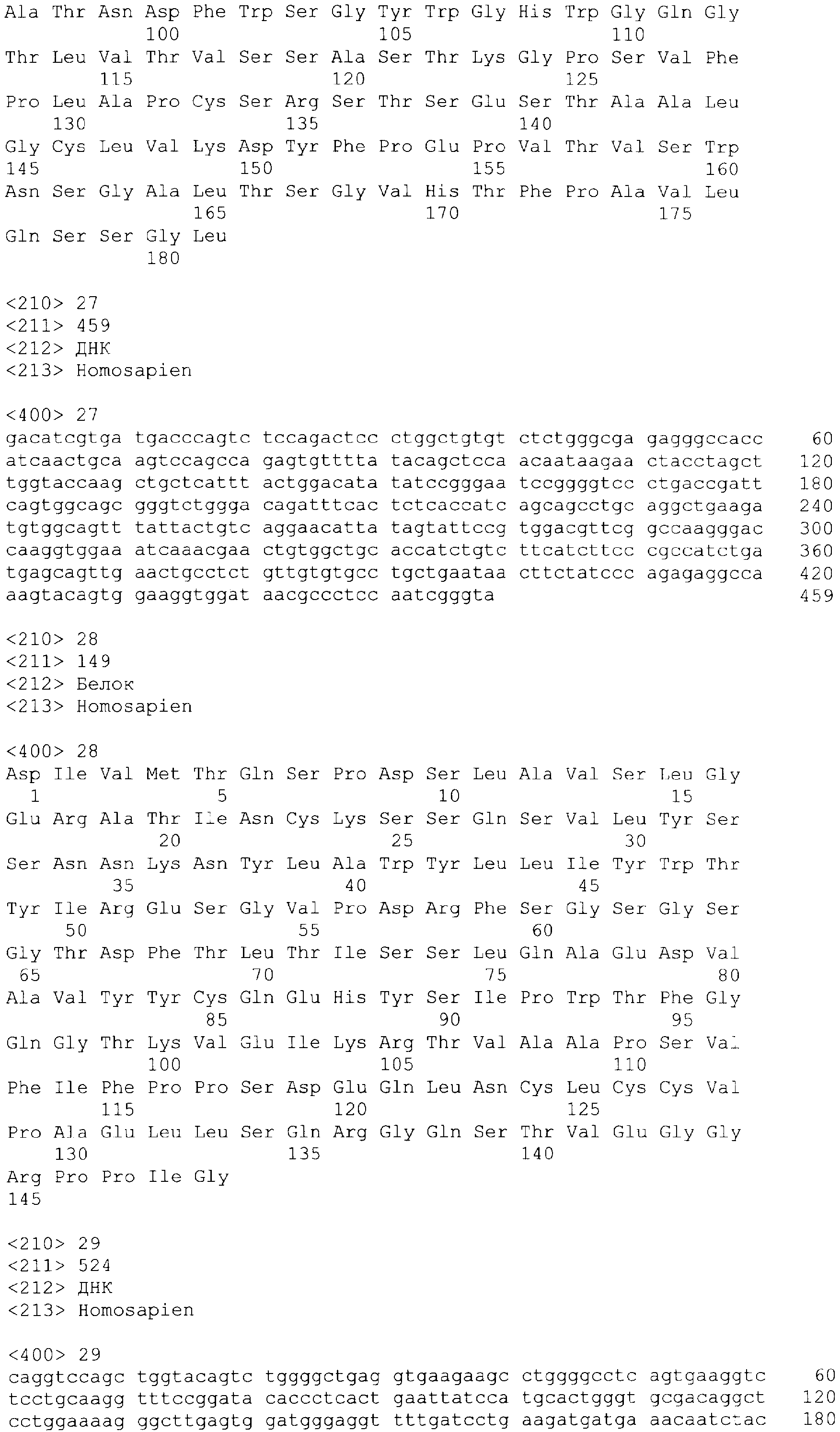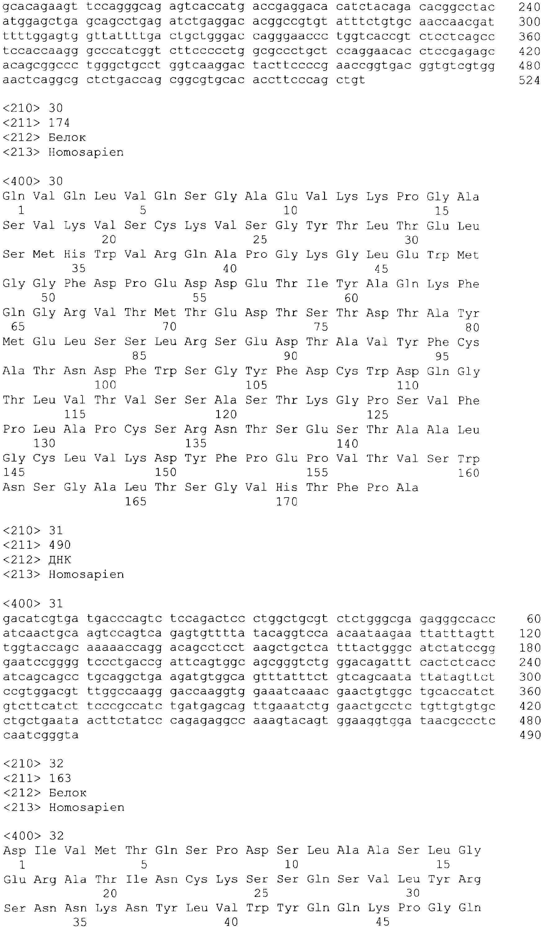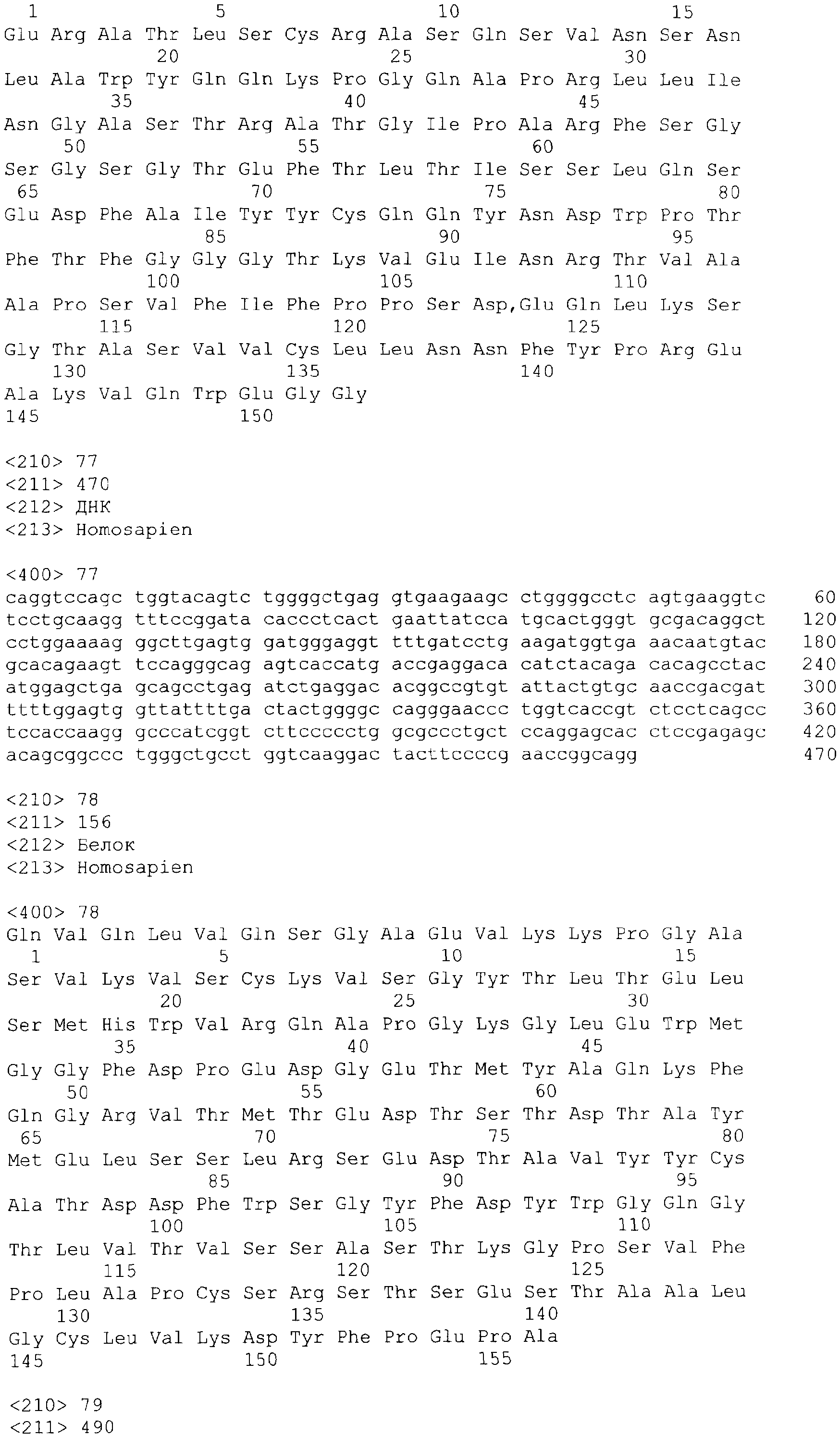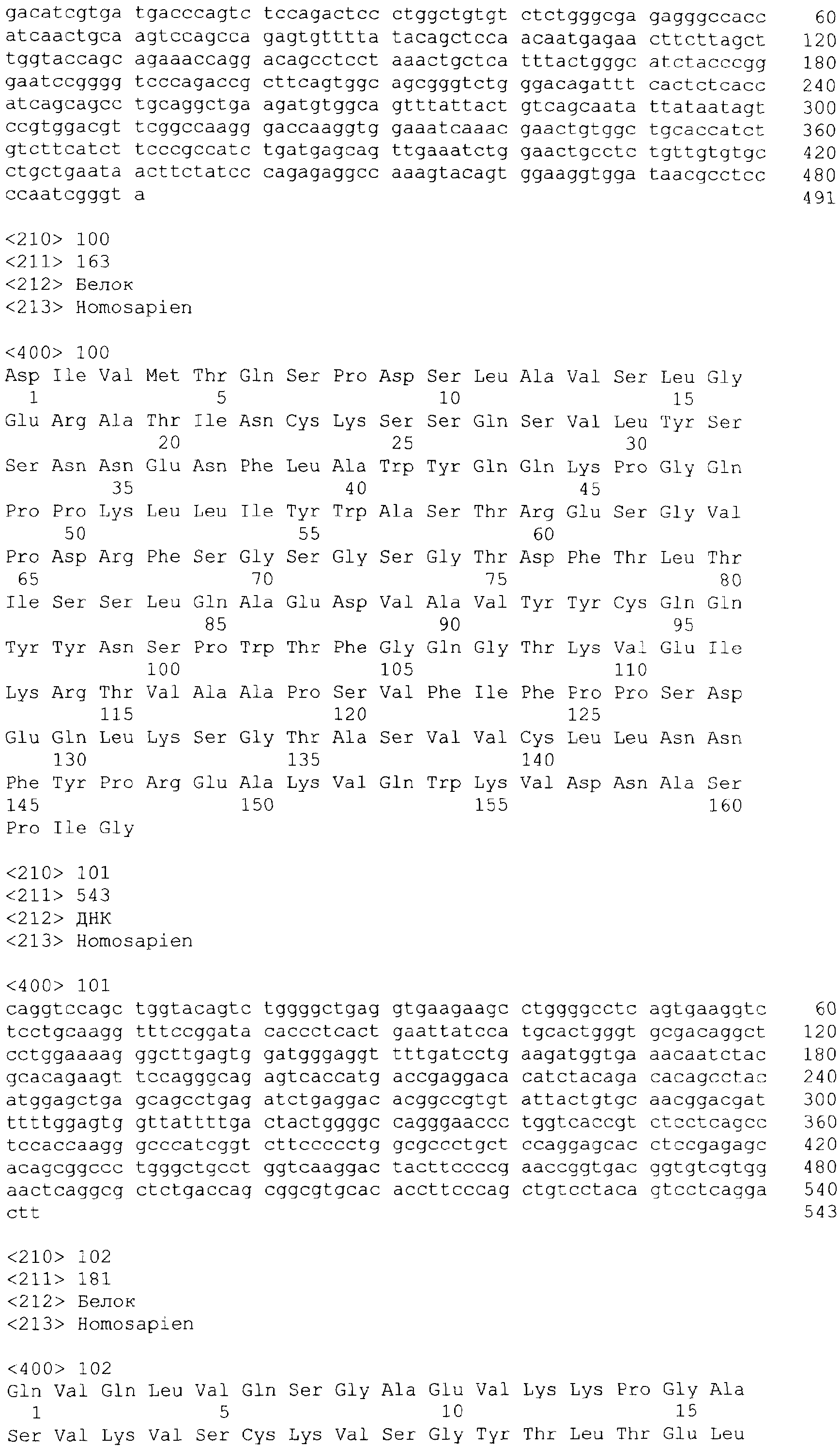 Нуклеотидные и аминокислотные последовательности вариабельной области тяжелой и легкой цепей репрезентативных человеческих анти-МСР-1 антител приводятся в нижеследующем систематизированном списке последовательностей, представленном в таблице 1.