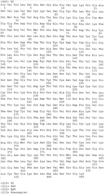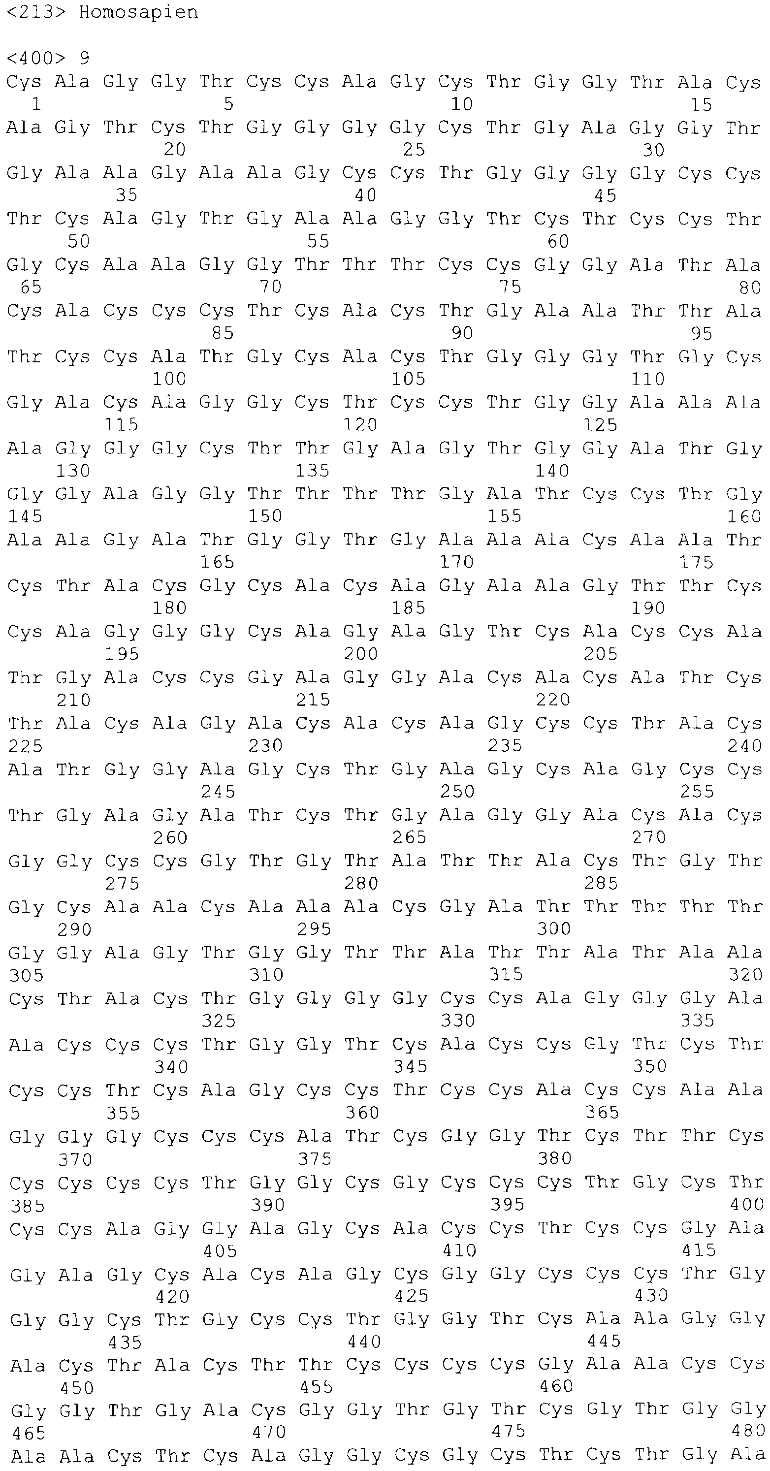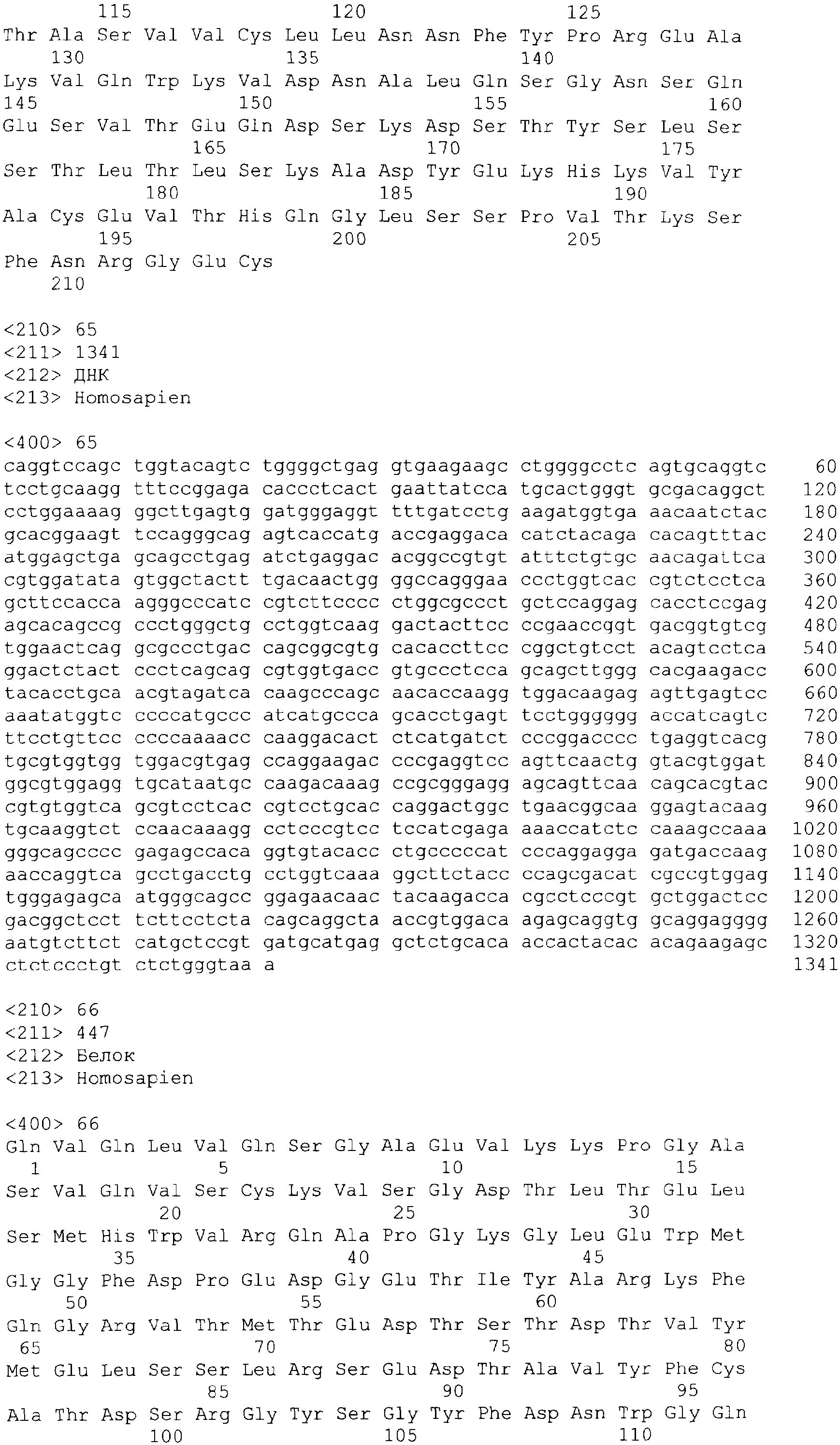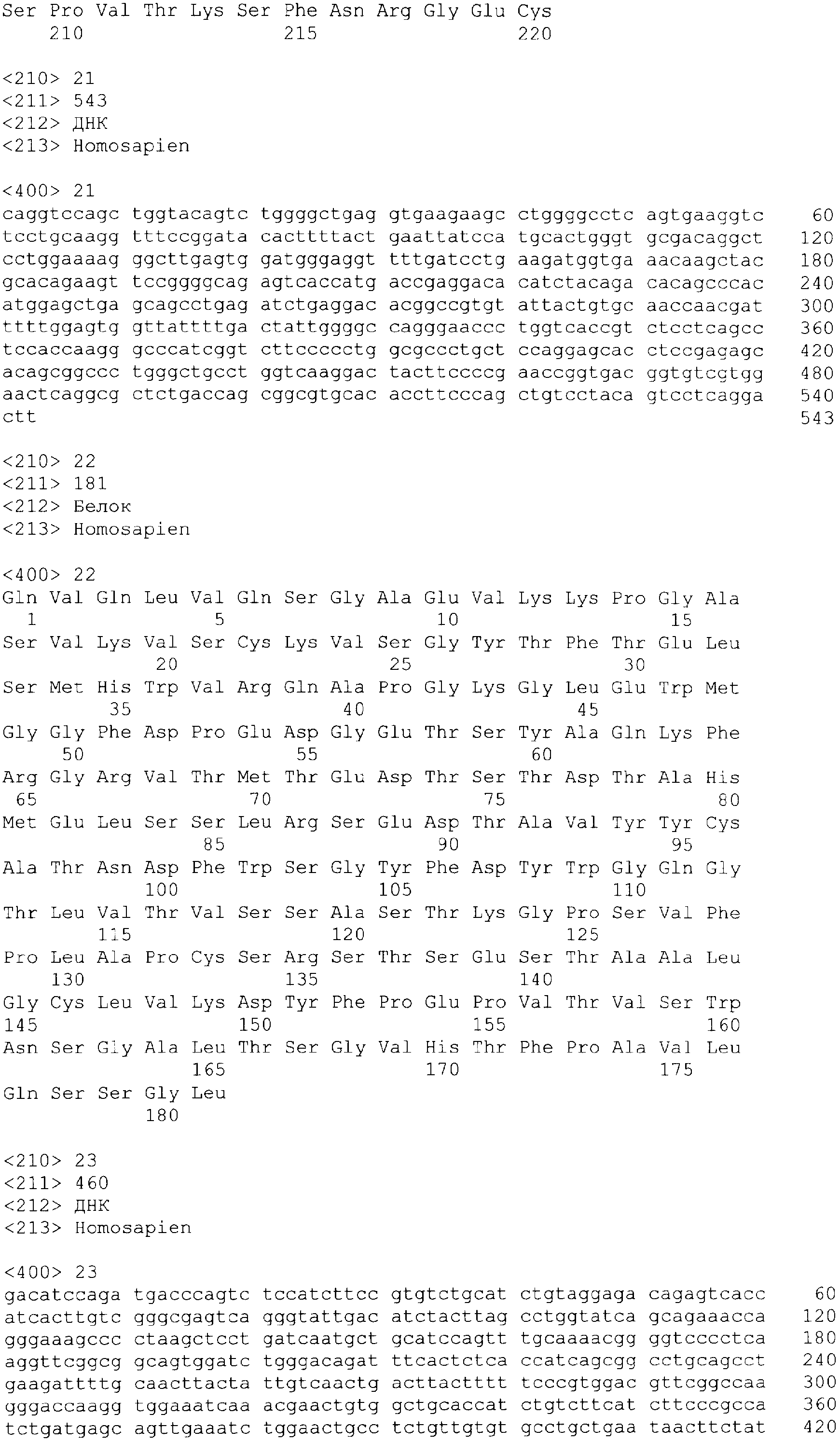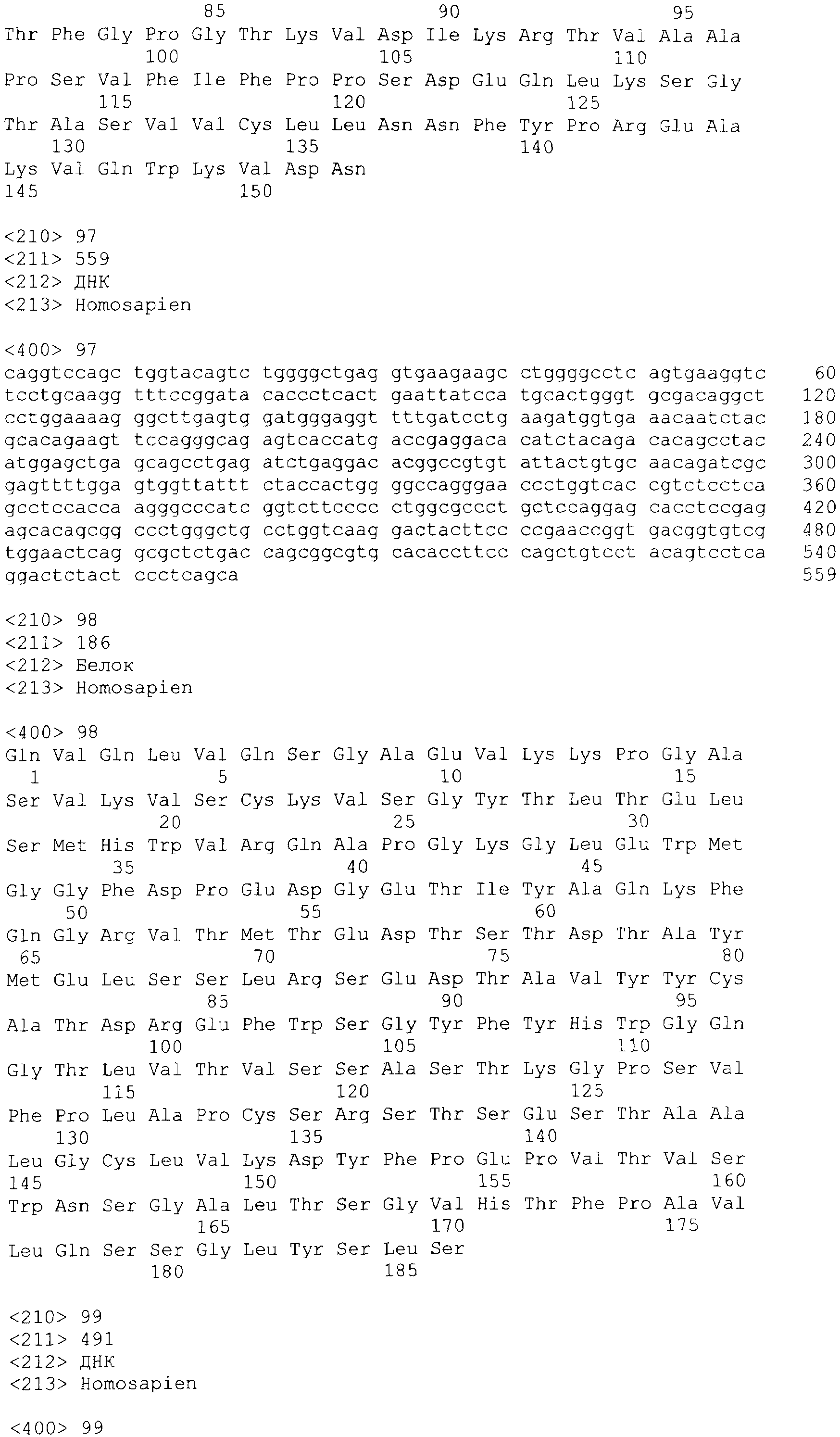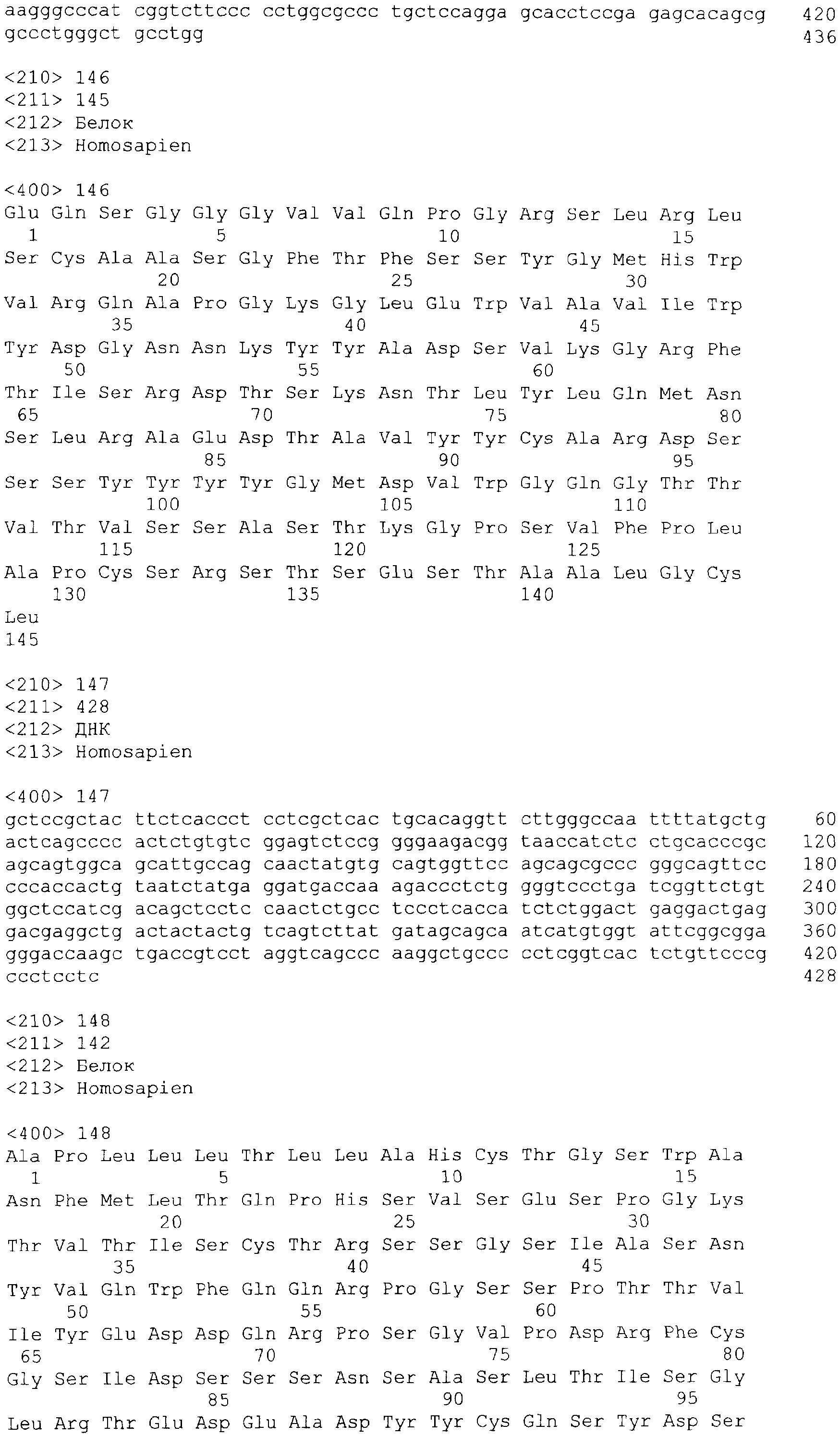 В другом своем варианте настоящее изобретение относится к полноразмерному человеческому антителу, которое связывается с МСР-1 и которое содержит аминокислотную последовательность тяжелой цепи, включающей области CDR, имеющие последовательности, представленные на фиг.7 и 10. Следует отметить, что определение областей CDR может быть легко осуществлено специалистом. В общих чертах CDR представлены в описании настоящего изобретения в соответствии с нумерацией по Кэбату (Kabat et al., Sequences of Proteins of Immunological Interest vols. 1-3 (Firth Edition, NIH Publication 91-3242, Bethesda MD, 1991).