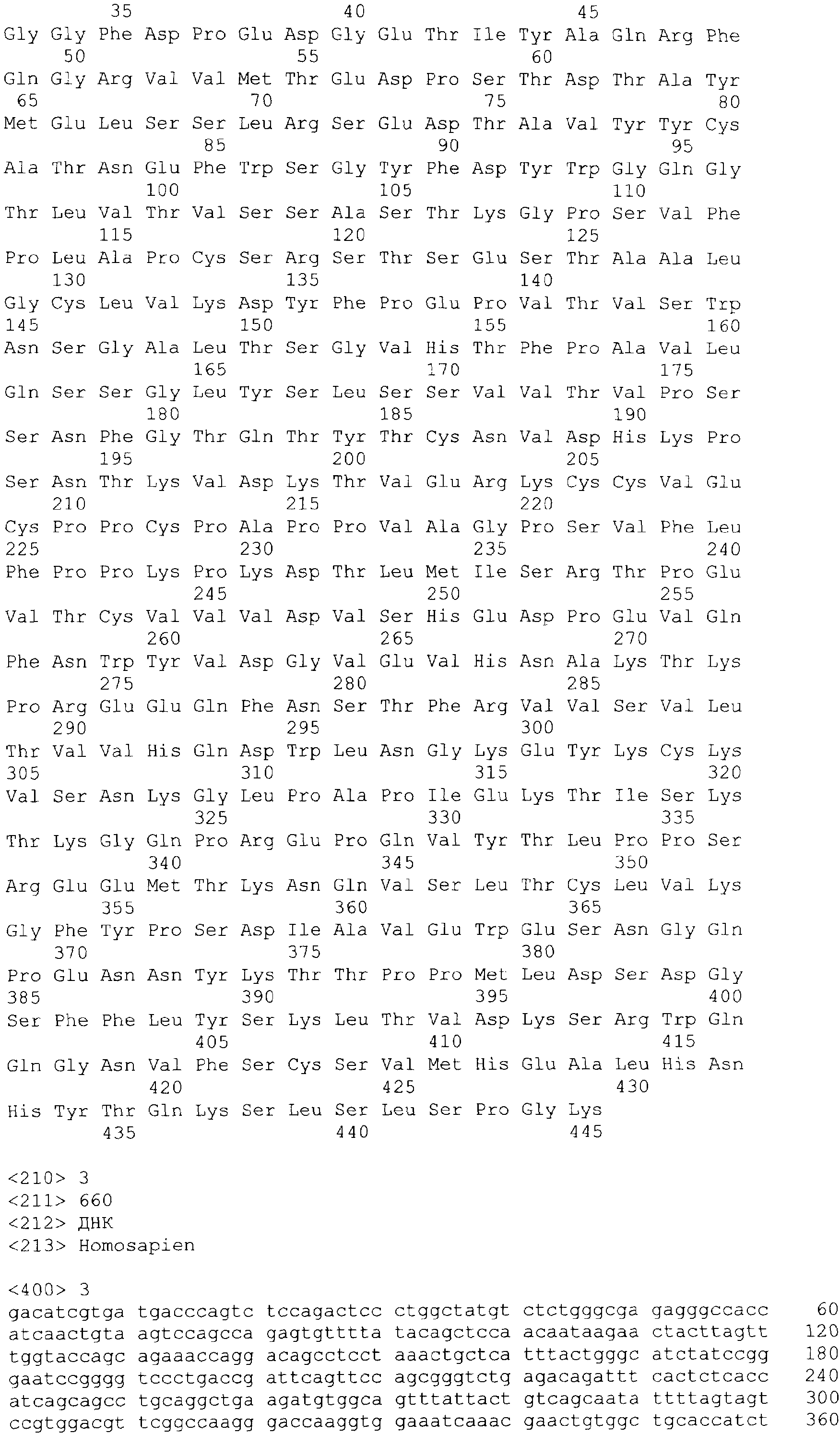 “Сэндвич”-анализ ELISA был разработан для количественной оценки уровней МСР-1 в человеческой сыворотке. Два анти-МСР-1 антитела, используемых в “сэндвич”-анализе ELISA, преимущественно распознавали различные эпитопы на молекуле МСР-1 (данные не приводятся). ELISA проводили следующим образом: 50 мкл анти-МСР-1 антитела для захвата в сенсибилизирующем буфере (0,1 М NaHCO3, рН 9,6), при концентрации 2 мкг/мл наносили на ELISA-планшеты (Fisher). После инкубирования при 4°С в течение ночи, планшеты обрабатывали 200 мкл блокирующего буфера (0,5% BSA, 0,1% Твин-20, 0,01% тимерозал в PBS) в течение 1 часа при 25°С. Затем планшеты промывали (3×) с использованием 0,05% Твин-20 в PBS (в промывочном буфере, WB). Сыворотку здорового человека или сыворотку пациента (Clinomics, Bioreclaimation) разводили в блокирующем буфере, содержащем 50% человеческую сыворотку. Планшеты инкубировали с пробами сыворотки в течение ночи при 4°С, промывали WB, а затем инкубировали со 100 мкл/лунку биотинилированного детектирующего анти-МСР-1 антитела в течение 1 часа при 25°С. После промывки планшеты инкубировали с ПХ-стрептавидином в течение 15 минут, промывали, как описано выше, а затем обрабатывали 100 мкл/лунку о-фенилендиамина в H2O2 (проявляющим раствором Sigma) для проявления окраски. Затем реакцию прекращали добавлением 50 мкл/лунку Н2SO4 (2 М) и анализировали с использованием планшет-ридера для ELISA при 492 нм. Концентрацию антигена PRO в пробах сыворотки вычисляли путем сравнения с разведениями очищенного антигена МСР-1 с помощью программы построения кривой по четырем параметрам.