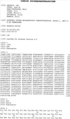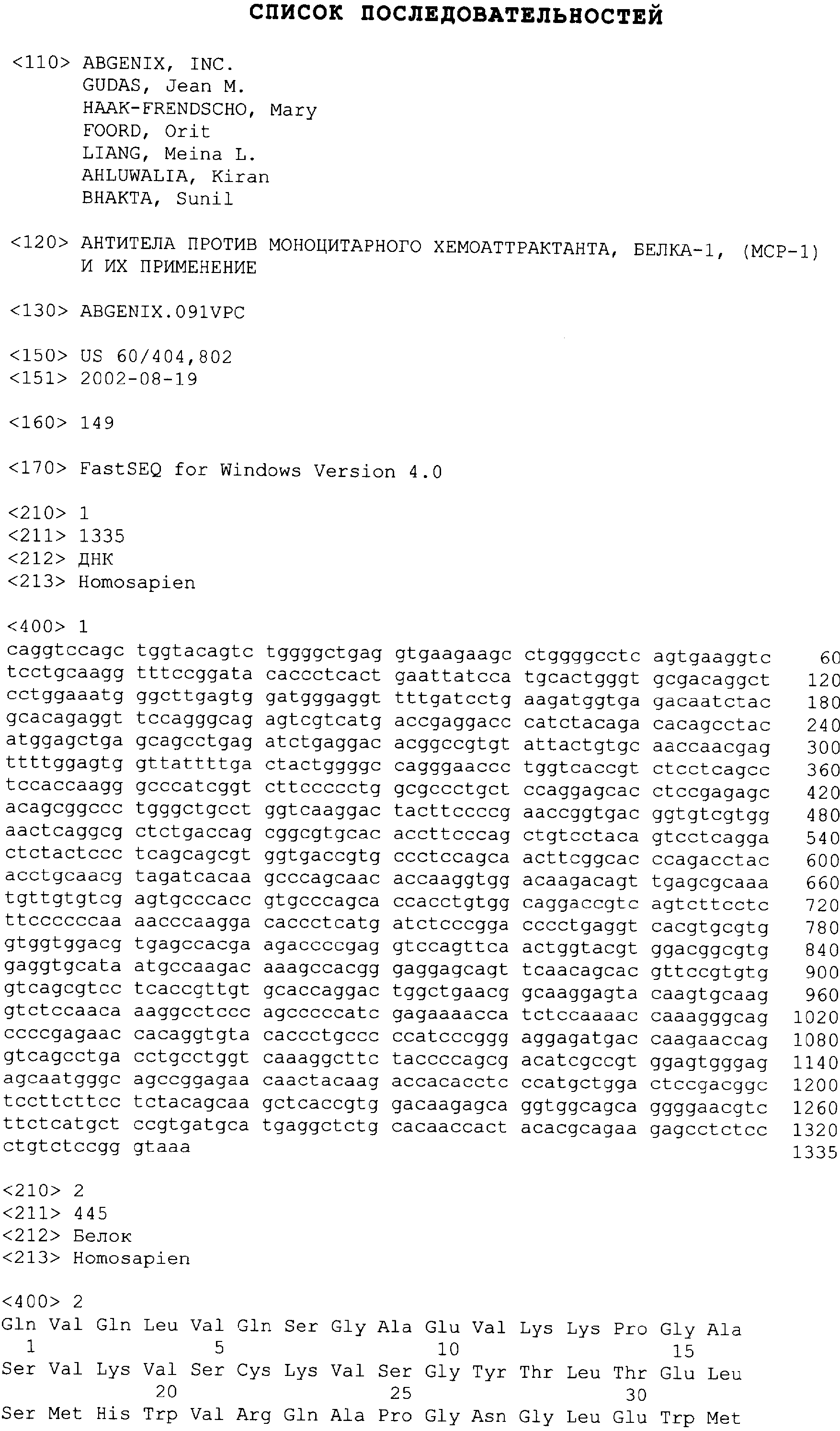 1. Моноклональное антитело, которое связывается с моноцитарным хемоаттрактантным белком-1 (МСР-1) и которое включает аминокислотную последовательность тяжелой цепи, причем указанная последовательность тяжелой цепи выбрана из группы, состоящей из SEQ ID NO: 2, 6, 10, 14, 18, 22, 26, 30, 34, 38, 42, 46, 50, 54, 58, 62, 66, 70, 74, 78, 82, 86, 90, 94, 98, 102, 106, 110, 114, 118, 122, 126, 130, 134, 138, 142 и 146 и дополнительно включает аминокислотную последовательность легкой цепи, причем указанная последовательность легкой цепи выбрана из группы, состоящей из SEQ ID NO: 4, 8, 12, 16, 20, 24, 28, 32, 36, 40, 44, 48, 52, 56, 60, 64, 68, 72, 76, 80, 84, 88, 92, 96, 100, 104, 108, 112, 116, 120, 124, 128, 132, 136, 140, 144 и 148.