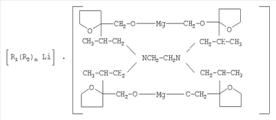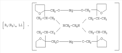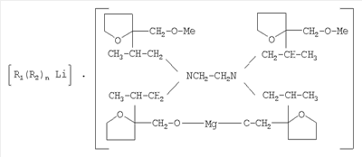 Модифицирующую добавку (лапрафурфурилат магния) получают следующим способом: на первой стадии получают (как описано в патенте РФ №2228339, МПК С08F 36/06, 136/06, 236/04, опубл. 10.05.2004) лапрамолат щелочного металла (N,N,N’,N’-тетра( -оксипропилат щелочного металла) этилендиамина) в растворе толуола. Затем к толуольному раствору лапрамолата щелочного металла добавляют тетрагидрофурфуриловый спирт (ТГФС). При этом протекает реакция между лапрамолатом щелочного металла и ТГФС, затем добавляют металлический магний или металлический магний и натрий.
