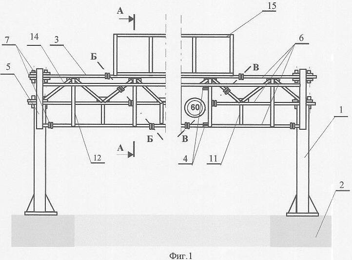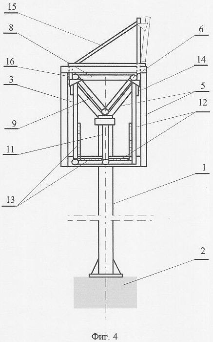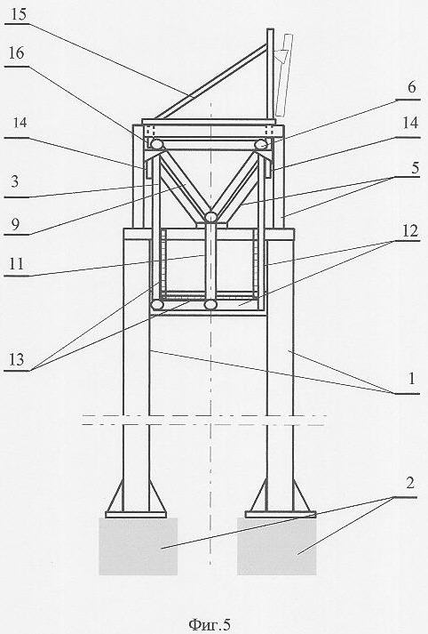 Несущая конструкция 3 выполнена в виде фермы (фиг.1-5), при этом продольные стержневые элементы 6 фермы жестко связаны между собой поперечными 8, наклонно-поперечными 9 и наклонными стержневыми 10 элементами с образованием в поперечном сечении треугольника (фиг.4, фиг.5) с вершинами, образованными сечениями продольных стержневых элементов 6, с верхней горизонтальной стороной, образованной одним из поперечных стержней 8, и одной из вершин, направленной вниз, образованной двумя наклонно-поперечными стержневыми элементами 9. С соответствующим продольным стержнем 6 одними концами жестко соединены центральные вертикальные стержни 11.