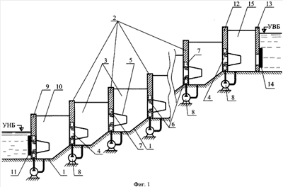 Кроме того, как вариант возможен способ заполнения рыбохода (фиг.1) водой из верхнего бьефа гидроузла, с последующим добавлением заполнения водой из нижнего бьефа гидроузла. Для этого приоткрывают верхний затвор 14 рыбохода, подают расход воды и осуществляют заполнение рыбохода водой из верхнего бьефа гидроузла (фиг.8). После заполнения водой входной камеры 10 рыбохода (входного оголовка рыбохода) до расчетного уровня НН включают систему струеобразующих насадков 6 на входной разделительной стенке 9 рыбохода с одновременным открытием нижнего затвора 11 рыбохода (фиг.9). Поддержание уровня воды НH во входной камере 10 рыбохода осуществляется за счет создания противодавления гидравлическими струями, образованными струеобразующими насадками 6 и размещенными по периметру рыбопропускного (вплывного) отверстия 4 во входной (первой) разделительной стенке 9 рыбохода. Величина НН – это максимальная величина напора, который может удержать водный поток, являющийся результатом взаимодействия гидравлических струй, истекающих из струеобразующих насадков 6, расположенных по периметру рыбопропускного (вплывного) отверстия 4 во входной (первой) разделительной стенке 9 рыбохода. После открытия нижнего затвора 11 рыбохода в добавление к работающей системе струеобразующих насадков 6 на входной (первой) разделительной стенке 9 рыбохода одновременно включают системы струеобразующих насадков 6 на всех остальных других разделительных стенках 2 и 12 рыбохода (фиг.10), а затем полностью открывают верхний затвор 14 рыбохода (фиг.11). С момента добавления к работающей системе струеобразующих насадков 6 на входной (первой) разделительной стенке 9 рыбохода одновременного включения систем струеобразующих насадков 6 на всех остальных других разделительных стенках 2 и 12 рыбохода к заполнению рыбохода водой из верхнего бьефа гидроузла добавится и заполнение рыбохода водой из нижнего бьефа гидроузла (фиг.10, 11). Повышение уровня воды в камерах рыбохода происходит не только за счет поступления воды из верхнего бьефа гидроузла, но и из нижнего бьефа гидроузла за счет эжекции гидравлическими струями, образованными струеобразующими насадками 6, дополнительного объема воды по цепочке из нижележащих камер рыбохода и далее из нижнего бьефа гидроузла. По окончании полного заполнения камер рыбохода водой рыбоход настраивают на определенную величину привлекающего потока вдоль всего рыбоходного тракта 1 и осуществляют привлечение и пропуск рыб из нижнего бьефа гидроузла в верхний бьеф (фиг.12).