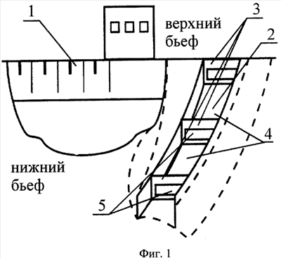 Помимо того, выпускные отверстия выпускающего коллектора равномерно размещают по всей длине нижней кромки рыбопропускного (вплывного) отверстия со стороны нижнего бьефа (фиг.3-5).