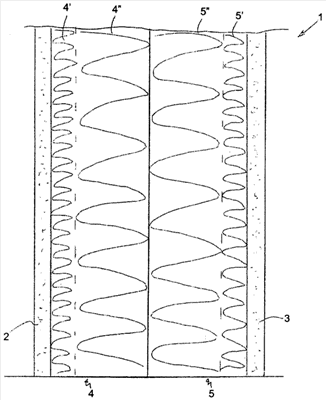 В альтернативном примере исполнения расстояние в свету между обеими внешними оболочками 2 и 3 может составлять 50 мм. Суммарная толщина многослойной изоляционной плиты 4, которой зеркально противолежит вторая такая же изоляционная плита 5, в этом случае составляет 27 мм. Для слоев с высокой объемной плотностью 4′ и 5′ можно выбрать величину объемной плотности около 160 кг/м3, а для слоев с малой объемной плотностью 4” и 5” – около 30 кг/м3.