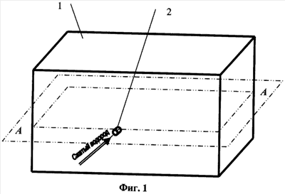 На Фиг.1 изображен внешний вид резервуарного строительного блока с основными конструктивными элементами: бетонный монолитный корпус 1 резервуарного строительного блока, который имеет на своей поверхности отверстие 2 впускной/выпускной трубки подключения к трубопроводной системе со сжатым водородом. На Фиг.1 обозначена плоскость графического сечения А-А, проходящая через ось отверстия 2 параллельно верхнему и нижнему ребрам корпуса 1, имеющего форму параллелепипеда.