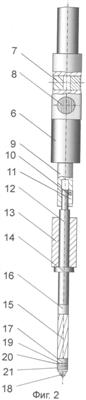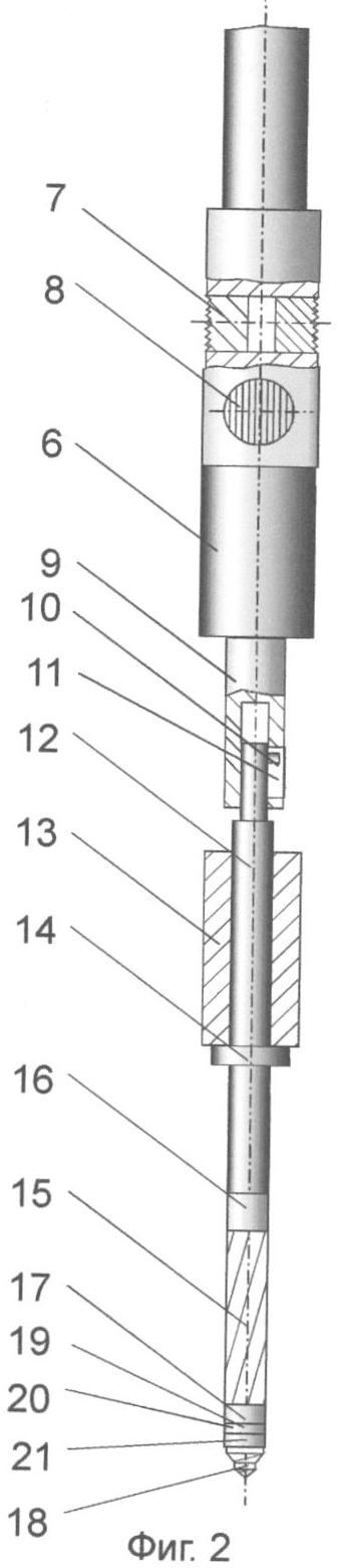 При этом верхний центратор 16 (см. фиг.2) гибкого вала 15, взаимодействуя со втулкой 3 (см. фиг.1), обеспечивает вращение без биения промежуточного вала 12 (см. фиг.2), а нижний центратор 17, вращаясь внутри выходной направляющей втулки 4 (см. фиг.1), обеспечивает центровку сверла 18 (см. фиг.2) и беспрепятственное, без «рыскания» начало сверления.