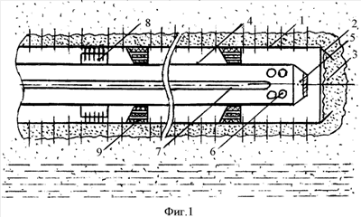 Внутреннее обустройство обсадной колонны, способствующее созданию равномерной депрессии на продуктивный пласт перфорированным участком обсадной колонны добывающей скважины или репрессии, соответственно, нагнетательной скважины, показано на фиг.1. На фиг.1 обозначено: 1 – равномерно перфорированный участок обсадной колонны в зоне горизонтального ствола, 2 – сужающийся патрубок, 3 – цементная пробка в патрубке, 4 – часть введенной от устья скважины трубы, 5 – конусообразная заглушка трубы, 6 – отверстия в трубе, 7 – введенный от устья скважины нагреватель, 8 – гидравлический якорь, 9 – опорное кольцо с конусообразным отверстием для трубы и отверстиями для прохода жидкостей.