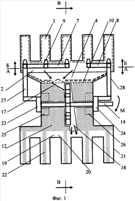 Предварительно перед началом работы из камер 2, 9, 17 МТТД удаляют воздух и закачивают рабочую жидкость, которую выбирают в зависимости от температурного потенциала холодной и горячей сред, отдельно в испарительную камеру 2 до полного насыщения фитиля 5 и совместно в рабочую и конденсационную камеры 12 и 19 соответственно (штуцера для удаления воздуха и подачи рабочей жидкости на фиг.1 не показаны), в количестве, достаточном для заполнения объема пор фитилей 13 и 22, резервуаров рабочей жидкости 25, 26, насосов 23, 24 и напорных трубопроводов 27, 28 с коллекторами 7 и 8, после чего корпус 1 МТТД устанавливают таким образом, чтобы испарительная камера 2 с испарительными гильзами 3 контактировала с горячей средой, а конденсационная камера 10 с конденсационными гильзами 21 – с холодной. В результате нагрева испарительных гильз 3 испарительной камеры 2 происходит испарение рабочей жидкости в канавках 6, находящейся в фитиле 5, который предотвращает образование паровой пленки на внутренней поверхности торца и таким образом интенсифицирует процесс испарения [6, с.22], образуется пар, создается давление в испарительной камере 2, полученный пар, проходя через перфорированный сепарационный элемент 11, освобождается от уносимых капель рабочей жидкости, которая отбрасывается на поверхность фитиля 5 и транспортируется им в испарительные гильзы 3, через паровое сопло 17 поступает на лопатки колеса силовой турбины 15, вращая его совместно с валом 14, который сообщает вращательное движение роторам питательных насосов 23 и 24 и вращающий момент М на рабочем конце вала 14, в результате чего в корпусе турбины 16 происходит изоэнтропное теплопадение пара с одновременным снижением его температуры и давления [3, с.331], после чего отработавший пар через патрубок мятого пара 18 попадает в конденсационную камеру 19 через распределительную секцию 20, где давление пара уменьшается еще в результате его дальнейшего расширения, откуда равномерно распределяется по конденсационным гильзам 21, конденсируется там за счет контакта наружной поверхности конденсационных гильз 21 с холодной средой, после чего образовавшийся конденсат всасывается подъемными фитилями 22 в поры фитиля 13, откуда под воздействием капиллярных сил и разрежения, создаваемого насосами 23 и 24, адиабатно [5, с.106] транспортируется в резервуары рабочей жидкости 25 и 26, откуда насосами 23 и 24 через напорные трубопроводы 27 и 28, коллекторы 7 и 8 и форсунки 9 под давлением, величина которого определяется рабочим давлением пара в испарительной камере 2, рабочая жидкость разбрызгивается по внутренней поверхности испарительных гильз 3, испаряется с поверхности канавок 6, в соответствии с вышеописанным процессом цикл повторяется. При этом парная установка питательных насосов 23 и 24, резервуаров 25 и 26, напорных трубопроводов 27 и 28 коллекторов 7 и 8 с форсунками 9 обусловлена необходимостью обеспечения равномерной нагрузки на фитиль 13 и равномерного распределения рабочей жидкости в испарительные гильзы 3.