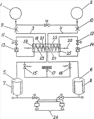 Работает система наддува топливных баков следующим образом. Для выдавливания и подачи топлива к потребителю, например, к РД КЛА 26 из топливных баков горючего 7 и окислителя 8 открывают пускоотсечные клапаны 11, 12 и газ, например гелий, из баллонов высокого давления 1, 2 (с давлением порядка 350 кГс/см2) проходит через дроссельные устройства 9, 10, где в процессе дросселирования наряду с понижением давления (порядка 350 кГс/см2) значительно понижается температура газа. Охлажденный газ далее поступает в контуры 21, 22 теплообменника 19, где за счет нагрева от СТР 20 подогревается до заданной температуры, после чего через пускоотсечные клапаны 11, 12 поступает в газовые редукторы 13, 14, вторично понижающие давление газа до заданного 10 кГс/см2 и необходимого для выдавливания топлива из топливных баков 7, 8 и подачи его к РД КЛА 26, при этом за счет нагрева улучшаются условия работы газовых редукторов 13, 14 и клапанов 11, 12. В результате вторичного понижения давления газа происходит также охлаждение его, что неблагоприятно сказывается на работе предохранительных клапанов 15, 16, сообщенных на выходе с безмоментным устройством 17, а также отрицательно воздействует на конструкцию топливных баков 7, 8 и состояние хранящегося в них топлива, подаваемого к потребителю. Для исключения указанных недостатков в состав подогревателя 18 дополнительно введены теплообменные контуры 23, 24, выполненные в виде змеевиков, размещенных в кожухе 25 теплообменника 19, при этом дополнительные теплообменные контуры 23, 24 включены в соответствующие пневмомагистрали 3, 4 перед предохранительными клапанами 15, 16 на входе в газовые полости 5, 6 топливных баков 7, 8. Таким образом, вторично охлажденный газ после газовых редукторов 13, 14 поступает в дополнительные контуры 23, 24, где дополнительно подогревается до заданной температуры, необходимой для нормальной работы указанной арматуры и топливных баков. Подогретый до заданной температуры газ из дополнительных теплообменных контуров 23, 24 поступает в газовые полости 5, 6 топливных баков 7, 8, из которых производится выдавливание и подача топлива к потребителю, например, к РД КЛА 26. Итак, введение в состав системы подогревателя 18 и дополнительных теплообменных контуров 23, 24 с включением их в их пневмомагистрали 3, 4 согласно предлагаемого технического решения позволяет повысить надежность и эффективность системы наддува топливных баков за счет подогрева и стабильного поддержания заданной температуры газа, наддуваемого в газовую полость 5, 6 топливных баков 7, 8, что обеспечивает выполнение поставленной задачи.