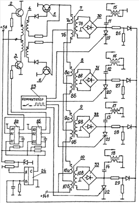 Отличие электросхемы преобразователя напряжения на чертеже от аналогичных однотрансформаторных с двумя и более нагрузками (по способу прототипа) состоит в их питании от отдельных выходных трансформаторов 7, 8, 9, 10, имеющих по две секции «а», «б» первичных обмоток, последовательно соединяемых согласованно с учетом их начал и концов по секциям «а» в общую коллекторную обмотку силового транзисторного ключа 5 и по секциям «б» – в коллекторную обмотку силового транзисторного ключа 6. При этом каждая секция содержит четвертую часть витков коллекторной обмотки, также четвертая часть первичного коллекторного напряжения приложена к каждой из них. Физическое отличие работы такого многотрансформаторного преобразователя заключается в нижеследующем. При отсутствии искрообразования накопительные конденсаторы 11, 12, 13, 14 заряжаются через мостовые выпрямители 30, 31, 32, 33 с вторичных обмоток своих выходных трансформаторов. При поступлении сигнала искрообразования с коммутатора 23 открывается тринистор 19 (условно первого цилиндра ДВС), его накопительный конденсатор 11 разряжается на первичную обмотку катушки зажигания 15 с образованием искрового разряда в первом цилиндре. При этом вторичная обмотка 7в выходного трансформатора 7 закорачивается через выпрямитель 30 тринистором 19 на общую точку (корпус) ППН, переводящим нагрузку выходного трансформатора 7 в режим короткого замыкания, соответствующего экстремальной нагрузке всего преобразователя. В полупериод, когда открыт силовой транзисторный ключ 5, первичный рабочий ток преобразователя проходит по секциям 7а, 8а, 9а, 10а коллекторной обмотки этого силового транзисторного ключа. В результате короткого замыкания снижаются: результирующий магнитный поток выходного трансформатора 7, индуктируемая им ЭДС секции 7а и, как следствие, ее сопротивление протеканию тока, который должен был бы значительно возрасти до восстановления этого потока. Но в данной схеме в последовательном соединении с секцией 7а находятся секции первичных обмоток 8а, 9а, 10а других выходных трансформаторов, работающих в это время в режиме номинальных нагрузок (без короткого замыкания в них). И поэтому даже при значительном падении сопротивления секции 7а до его активной составляющей остальные секции ограничивают рост тока, перераспределяя между собой первичное напряжение коллекторной обмотки силового транзисторного ключа 5, соответственно увеличивая приложенное к каждой из них на 1/3 своего предшествующего значения и на столько же общий ток первичных обмоток (в данной схеме). На время этого ограничения выходной трансформатор 7 вынужденно переходит в режим работы трансформатора тока, в котором связь между первичной и вторичной обмотками характеризуются равенством их ампервитков (при сохранении коэффициента трансформации)