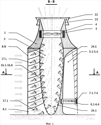 28. Система по п.14, отличающаяся тем, что площадь каждого внутреннего сечения первого вертикального канала ПВВП равна или меньше суммы площадей первых выходных отверстий первых конфузорных каналов, которые расположены ниже относительно этого внутреннего сечения.
