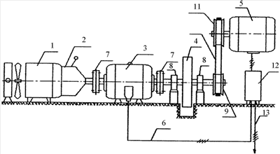 Для управления работой электрической частью системы установлен пульт управления 12, который производит включение и отключение синхронного электродвигателя и подачу напряжения потребителю по кабелю 13.