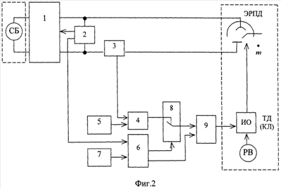 Устройство содержит преобразователь напряжения 1, входные выводы которого подключены к шинам СБ, а выходные выводы – к электродам ЭРПД, датчики напряжения 2 и тока анода 3, включенные между преобразователем напряжения 1 и двигателем ЭРПД, схему сравнения токов 4, первый вход которой соединен с выходом датчика тока 3, второй вход – с источником эталонного напряжения 5, соответствующего максимально допустимому анодному току, а выход схемы сравнения токов 4 через коммутирующий элемент 8 соединен с первым входом усилителя формирователя расхода, выход ДН 2 соединен с первым входом схемы сравнения напряжений 6, а второй вход схемы сравнения напряжений 6 – с источником эталонного напряжения 7, соответствующего максимально допустимому анодному напряжению, первый выход схемы сравнения напряжений 6 подключен ко входу коммутирующего элемента 8, а второй выход схемы сравнения напряжений 6 соединен с усилителем – формирователем расхода 9 рабочего вещества, подключенного к исполнительному органу ИО (термодросселю ТД или клапану Кл), осуществляющего подачу рабочего вещества из бака хранения РВ в ЭР ПД.