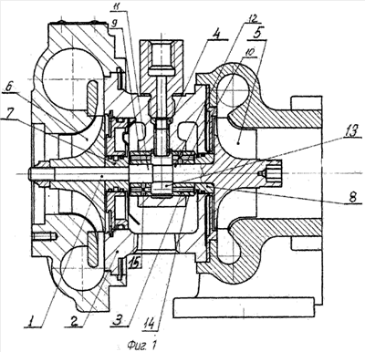 Турбокомпрессор состоит из ротора 1, установленного в корпусе 2 посредством подшипникового узла, состоящего из плавающей невращающейся моновтулки 3, которая установлена с зазором в расточке корпуса 2 и зафиксирована от проворота посредством полого фиксатора 4, соединенного с маслоподводящей магистралью. На валу ротора 1 по обе стороны моновтулки 3 со стороны рабочих колес турбины 5 и компрессора 6 насажены втулки-кольцедержатели 7 и 8, которые своими торцевыми поверхностями со стороны моновтулки 3 совместно с прилегающими торцами моновтулки 3 образуют упорный подшипник. Сопрягаемые торцовые поверхности втулок-кольцедержателей 7, 8 и моновтулки 3 выполняются гладкими посредством шлифования. Радиальный подшипник турбокомпрессора образован двумя гладкими цилиндрическими расточками 9 и 10 в моновтулке 3, в которые с зазором входит вал ротора 1 своими гладкими шлифовальными поверхностями-шипами 11 и 12. Между опорными рабочими поверхностями 9 и 10 радиального подшипника в плавающей невращающейся моновтулке 3 выполнена цилиндрическая расточка, образующая совместно с валом ротора 1 и фиксатором 4 маслораспределительную полость 13, в которую подводится смазывающий материал из централизованной системы смазки ДВС. Подвод смазывающего материала к рабочим поверхностям с обеих сторон упорного подшипника осуществляется непосредственно из маслораспределительной полости 13 по продольным каналам 14, радиальным каналам 15, расположенным по обе стороны маслораспределительной полости 13, оси которых расположены соосно оси ротора 1 и равномерно на окружности диаметром