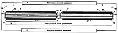 Нарушение равновесного состояния исполнительного механизма 15 в требуемых диапазоне значений и направлении осуществляется через соответствующее изменение паритета давлений Р1 Р2 на выходах дифференциального распределительного устройства 6. Достигается такое состояние за счет подачи управляющих токовых сигналов Ix=Io с противофазных выходов электронного блока 14 управления на управляющие обмотки 12, 13 соответственно I12=Io±Ix и I13=Io Ix. В результате укорочения и удлинения стержневых и трубочных исполнительных элементов 7, 8 и 10, 11 L7=Lo± L, L10=Lo L, L7,10=L7-L10=±2· L, и L8,11= 2· L (по аналогии) дифференциального распределительного устройства 6 цилиндрическая заслонка 9 будет перемещаться в диапазоне значений l9=L7,10-L8,11=±4· L. На это же значение изменяется и ее щелевой радиальный зазор h=l9, обеспечивая соответствующее перераспределение выходных рабочих давлений Р1 и Р2, которые подаются на исполнительный механизм 15, сравниваются с входным давлением Р (давлением напора) и перемещают его золотниковый элемент в указанном диапазоне и заданном направлении.