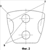 Сегмент состоит из контактного элемента 2, предназначенного для взаимодействия с пятой подшипника, и опорного элемента 3, предназначенного для установки сегмента на опорной шайбе подпятника с возможностью качания и самоустановки относительно пяты подшипника. Форма периметра контактного и опорного элементов соответствует форме периметра сегмента, при этом они расположены один над другим и соединены между собой. На верхней поверхности контактного элемента образовано антифрикционное покрытие 4, а на нижней поверхности опорного элемента выполнен выступ 5, предназначенный для установки сегмента на опорной шайбе с возможностью качания и самоустановки под углом, зависящим от режимов работы подшипника. Самоустановка происходит под действием гидродинамических сил в потоке жидкости, возникающих при вращении пяты, зеркало которой взаимодействует с поверхностью сегмента в процессе работы подшипника. Опорная поверхность 6 выступа может быть выполнена плоской – в виде боковой грани многогранника (см. Фиг.3) или в виде части боковой поверхности цилиндра (на чертежах не показано).