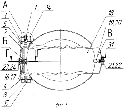 Существо изобретения поясняется чертежами. На фиг.1 показан общий вид вакуумного механического ввода, на фиг.2 – вид А на фиг.1, на фиг.3 – вид Б и В на фиг.1, на фиг.4 – сечение Г-Г на фиг.1.