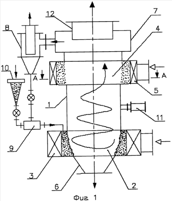 Данное устройство включает корпус 7 (фиг.1), вихревую камеру 2 с тангенциальными щелевыми каналами подвода газа 3, вихревую камеру 4 с тангенциальными щелевыми каналами подвода газа 5 (фиг.2), патрубок для удаления зольных отложений 6, центробежный ловитель для твердых частиц 7, циклон 8, узел подачи угля 9 с бункером 10, горелку 11 и патрубок для выхода продуктов сгорания 12.