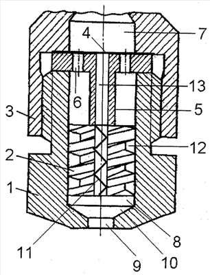 Шнек 2 форсунки может быть выполнен из твердых материалов: карбида вольфрама, рубина, сапфира. При среднем диаметре дроссельного отверстия 9, находящемся в диапазоне 2,5…3,5 мм, и давлении жидкости 6…9 МПа обеспечивается распыление от 400 до 1000 кг/ч жидкости. Форсунка проста в изготовлении и обслуживании.