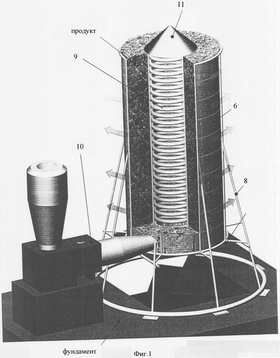 В полости внутренней обечайки по всей ее высоте размещен теплообменный элемент 9, выполненный в виде спирали, соединенной с газовым выходом газогенератора 10.