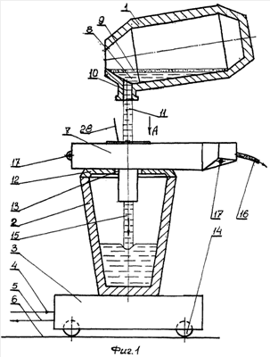 Из промежуточного устройства 7 металл в виде струи/потока 15 направляется в стальковш 2, а шлак потоком 16 (фиг.1 и 3) направляется за пределы промежуточного устройства. Промежуточное устройство 7 снабжено приливами с отверстиями 17 для снятия (установки) его на ковш/крышку ковша. В промежуточном устройстве 7 предусмотрена открытая сверху емкость 18, расположенная в металлическом корпусе 19, в котором выложен огнеупорный материал.