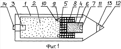 К передней части корпуса присоединен тонкостенный головной колпак 11, в головной части которого установлены головной контактный узел 12 и приемник команд 13. Эти элементы соединены электрическими связями с донным взрывателем 3, детонатором 7 и воспламенителем 10 (не показаны). Предусмотрено исполнение снаряда с вводом команд через донный приемник команд 14.