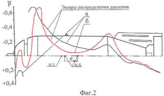 Применение указанной кольцевой проточки 6 в головной части авиабомбы резко уменьшило (см. фиг.2) величину давления в головной части авиабомбы, что, с одной стороны, способствует перераспределению давления вдоль корпуса авиабомбы, смещая центр давления (ц. д.) от центра тяжести (ц. т.) ближе к хвостовой части, увеличивая запас устойчивости авиабомбы на воздушном участке траектории и снижая перегрузки при ее приводнении, и, с другой стороны, обеспечивает устойчивое движение авиабомбы на подводном участке траектории с максимально возможной скоростью.