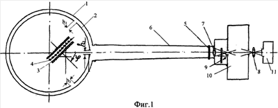 Исследуемый образец материала 3 с нагревателем 4 установлены на подвеске (на фиг.1 не показана), ось вращения которой смещена относительно линии визирования на расстояние, позволяющее выводить образец из поля зрения приемника излучения 11.