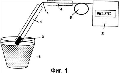 Держатель 4 удерживает оптическое волокно 1, и этот держатель служит в качестве его направляющей. Для обеспечения свободной подвижности оптического волокна 1 его вводят в измерительное устройство 2 через петлю 5. Эталонное вещество 3, расположенное на одном конце оптического волокна 1, погружено в расплавленный металл 6 (например, внутри плавильной печи). Расплавленным металлом 6 является, например, расплавленный чугун или расплавленная сталь. Эталонным веществом 3 в этом случае является, например, серебро. Реперной температурой является температура плавления серебра. Она является меньшей, чем температура плавления расплавленного чугуна или расплавленной стали. Конец оптического волокна 1 с эталонным веществом 3 погружен в расплавленный металл 6 при помощи держателя 4. Там сначала происходит нагрев эталонного вещества 3 до его температуры плавления. Таким образом, сигнал, поданный через оптическое волокно 1 в измерительное устройство 2, сравнивают с соответствующим теоретическим значением сигнала и таким способом производят калибровку измерительного устройства 2. После плавления эталонного вещества 3 происходит его дополнительный нагрев до фактической температуры плавления расплавленного металла 6. Производят оценку сигнала, поданного таким способом оптическим волокном 1 в измерительное устройство 2, например, путем преобразования в соответствующее температуре значение электрического сигнала, и производят его дополнительно обработку в измерительном устройстве 2. Электрический сигнал может быть преобразован в оптически отображаемое значение температуры. Таким образом, сначала осуществляют калибровку измерительного устройства 2, а затем измеряют фактическую температуру расплавленного металла 6. На фиг.4 показан график кривой температуры, полученный в течение этих последующих операций обработки. Здесь значением, достигнутым на первом пологом участке, является температура плавления эталонного вещества 3 (серебра), а следующим значением на пологом участке является температура расплавленного металла 6. На держателе 4 жестко установлено вибрационное устройство, которое на чертежах не показано. Такие вибрационные устройства известны, например, из заявки DE 4433685 А1 на патент Германии.