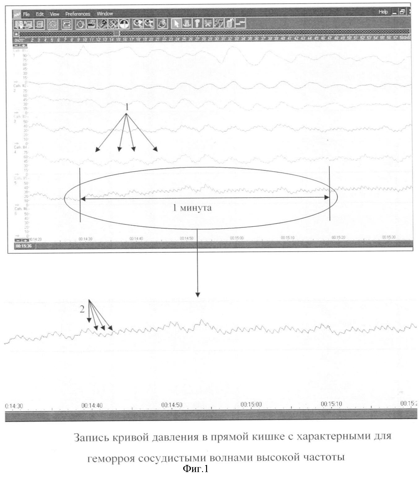 фиг.1 – запись кривой давления в прямой кишке с характерными для геморроя сосудистыми волнами высокой частоты, где 1 – редкие колебания (частота 11-12 в 1 минуту); 2 – колебания высокой частоты (частота соответствует сердечному ритму, частота 74-76 в 1 минуту);