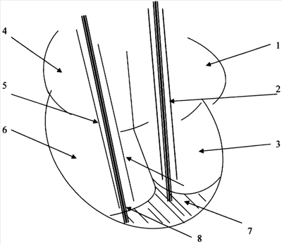 Слева от срединной линии выделяли плечеголовную вену, подводили под нее лигатуру. Надсекали стенку вены в дистальной части и вводили катетер 2 в проксимальном направлении до упора. Лигатуру завязывали, тем самым закрепляли катетер в сосуде, и проводили через полость катетера электрод 8.