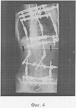 В операционной под действием эндотрахеального наркоза после 3-кратной обработки операционного поля 76° спиртом, через микронадрезы кожи в ножки дуг ThIV, ThV, ThVI, ThX, ThXI, LIII с двух сторон под контролем ЭОП вводят стержни-шурупы 1-6 (Фиг.1). Через микронадрезы кожи в крылья подвздошных костей вводят по два стержня – шурупа 7, 8 с двух сторон. Выполняют гемостаз.