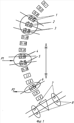 В операционной под действием эндотрахеального наркоза после 3-кратной обработки операционного поля 76° спиртом, через микронадрезы кожи в ножки дуг ThIV, ThV, ThVI, ThX, ThXI, LIII с двух сторон под контролем ЭОП ввели стержни-шурупы 1-6 (Фиг.1). Через микронадрезы кожи в крылья подвздошных костей ввели по два стержня-шурупа 7, 8 с двух сторон. Выполнили гемостаз.