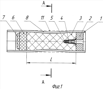 Работа МРД. Перед запуском в полость формообразующего устройства 4 устанавливают электровоспламенитель (на фиг.1 не показан), представляющий собой спираль накаливания с нанесенной на ней пиротехнической обмазкой. Образующиеся после подачи электрического импульса на спираль продукты сгорания пиротехнической обмазки нагревают фольгу 5 и воспламеняют заряд 3. Поперечное сечение корпуса 1 под действием внутреннего давления из эллиптического принимает круглую форму 11. При этом за счет перемещения пастообразного заряда к переднему днищу несколько увеличивается горящая поверхность заряда, после выгорания которого поджигается замедлитель-трассер 6, а после его сгорания срабатывает вышибной заряд 7.