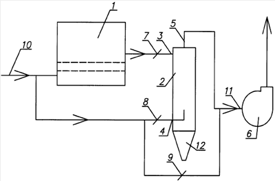 Из общего трубопровода подачи воздуха 10 наружный воздух подают на охлаждение продукта, находящегося в колосниковом охладителе 1, например глиноземного спека или цементного клинкера. Частично пыль, содержащаяся в охлаждающем воздухе, оседает в охладителе 1, для окончательной очистки воздух подают через открытый дроссельный клапан 7 в верхний входной патрубок 3 вихревого инерционного пылеуловителя 2. В нижний входной патрубок 4 подают через открытый дроссельный клапан 8 поток воздуха из общего трубопровода подачи воздуха 10 в установку. Отделенная в пылеуловителе 2 пыль поступает в конусный бункер 12. Очищенный воздух из осевого выходного патрубка 5 поступает во всасывающий патрубок 11 вытяжного вентилятора 6 и далее сбрасывается в атмосферу.
