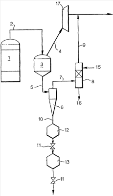 Поток твердой фазы 10 непрерывно подают в сборную емкость 12. Из этой емкости 12 твердая фаза может выгружаться в окружающую среду через бункер со шлюзовым затвором, снабженный задвижками 11. Использование бункера со шлюзовым затвором является предпочтительным для того, чтобы перевести твердую фазу из зоны с повышенным уровнем давления, при котором ведут технологический процесс, до атмосферного давления, при котором с твердой фазой могут производиться дальнейшие действия (транспортировка).