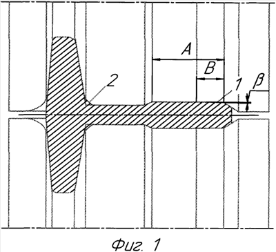 При прокатке в предчистовом калибре (фиг.1) верхняя часть «головки» профиля имеет утонение, за счет того, что в калибре имеется компенсатор 1 длиной В, равной 1/3 высоты головки А с углом наклона , равным 2°-2°30′, который позволяет компенсировать бочкообразование по верху «головки» при последующей прокатке в чистовом калибре. Также калибр имеет уклон 2 от «шейки» к «подошве» профиля для лучшей зацентровки при прокатке в чистовом калибре.