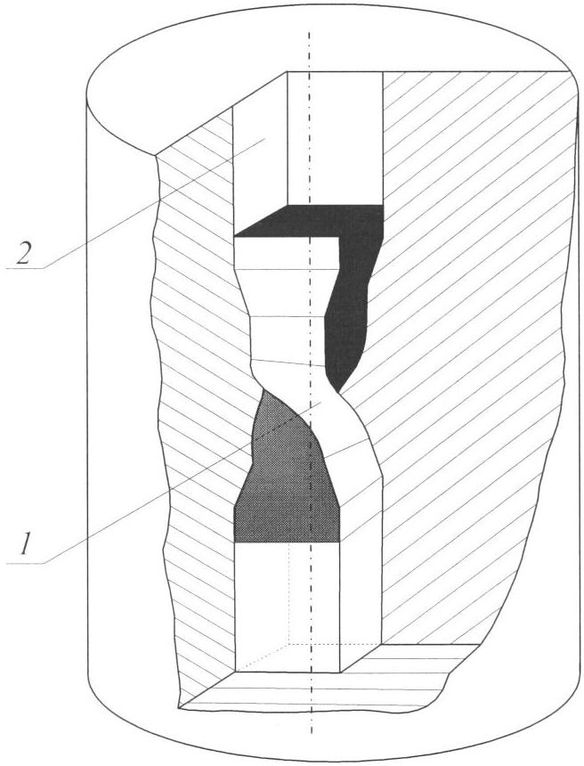 Заготовку 1 размещают в канал 2, с помощью пуансона выдавливают через сужающуюся часть. Сужающаяся часть канала 2 выполнена винтовой с постоянным вдоль оси сечением и с изменяющимся по высоте сужающейся части канала углом наклона винтовой линии к оси прессования. В процессе продавливания заготовка подвергается осадке при переходе в сужающийся участок канала, в сужающейся части канала испытывает поперечный сдвиг, при выходе на конечный участок канала приобретает исходное поперечное сечение.