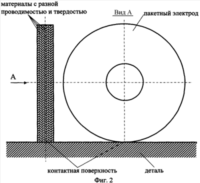 Как видно из фиг.1, распределение плотности тока по контактной поверхности при использовании однородного материала электрода неравномерно. Плотность тока возрастает от оси к границам контактов в результате растекания тока в электроде и детали. Для более равномерного распределения плотности тока предлагается использовать пакетный электрод, собранный из материалов с разной проводимостью. Чем больше материалов с разной проводимостью в пакетном электроде, тем более равномерно будет распределение плотности тока по контактной поверхности. Использование электродов со сферической рабочей поверхностью также не гарантирует равномерного распределения тока по контакту из-за деформации электрода и детали. Для более равномерного износа электрода по рабочей поверхности необходимо, чтобы материалы, составляющие пакетный электрод, были разной твердости, причем твердость материалов должна увеличиваться от центра к краю. Для реализации данного пакетного электрода в качестве материала сердцевины пакетного электрода можно использовать чистую медь, а в качестве материалов с пониженной электропроводностью и повышенной твердостью – сплавы меди с бериллием, кадмием или другие бронзы.