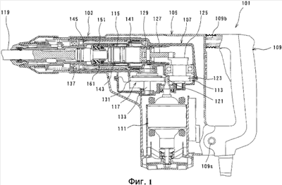 Корпус 103 включает кожух 105 электродвигателя, в котором размещен приводной электродвигатель 111, и кожух 107 зубчатой передачи, в котором размещен механизм 113 преобразования движения, механизм 117 передачи мощности и ударный механизм 115. Механизм 113 преобразования движения приспособлен для соответствующего преобразования выходного вращающего момента приводного электродвигателя 111 в прямолинейное движение и затем для передачи его ударному механизму 115. В результате создается ударная сила в осевом направлении ударного долота 119 через ударный механизм 115. Кроме того, скорость вращения на выходе приводного электродвигателя 111 соответственно 10 понижается механизмом 117 передачи мощности и затем передается ударному долоту 119. В результате вызывается вращение ударного долота 119 в направлении по окружности. Рукоятка 109 имеет, в целом, U-образную форму в виде сбоку и имеет нижний конец и верхний конец. Нижний конец рукоятки 109 с возможностью поворота соединен с нижней частью заднего конца кожуха 105 электродвигателя при помощи шарнира 109а, а верхний конец соединен с верхней частью заднего конца кожуха 105 электродвигателя при помощи упругой пружины 109b для поглощения вибрации. Таким образом, передача вибрации от корпуса 103 к рукоятке 109 уменьшена.