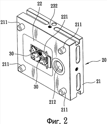 Как показано на Фиг.1А, 2, 6 и 10, предпочтительный вариант осуществления конструкции (М) пресс-формы в соответствии с данным изобретением включает в себя основание 2 пресс-формы и выводящий узел. Основание 2 пресс-формы включает в себя пару из нижней и верхней секций 20, 40 пресс-формы. Выводящий узел включает в себя множество верхних выводящих секций 30 (только одна показана на Фиг.1А и 10) и множество нижних выводящих секций 50 (только одна показана на Фиг.1А и 10). Верхняя секция 20 пресс-формы включает в себя верхнюю половину 21 пресс-формы, верхнюю сердцевину 22 пресс-формы, верхнюю вентиляционную секцию 23 (см. Фиг.14), состоящую из верхней воздушной камеры 231 и вентиляционного отверстия 232, соединенного с верхней воздушной камерой 231, и удерживающий трубку элемент 24. Нижняя секция 40 пресс-формы 40 включает в себя нижнюю половину 41 пресс-формы, нижнюю сердцевину 42 пресс-формы, нижнюю вентиляционную секцию 43, состоящую из нижней воздушной камеры 431 и вентиляционного отверстия 432, соединенного с нижней воздушной камерой 431, и подвижный элемент 44. Пневматическое устройство 60 может быть соединено с основанием 2 пресс-формы так, что верхняя и нижняя воздушные камеры 231, 431 соединены с ней через вентиляционные отверстия 232, 432 соответственно. Гидравлическое устройство 70 может быть соединено с нижними выводящими секциями 50 для перемещения их по вертикали.