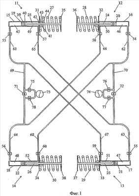 При деформации объемы жидкости, соответствующие объемам штоков, проходят из одного диагонального контура в другой диагональный контур через первый и второй каналы 69, 70 наклона. Поэтому гидравлическая система имеет незначительную жесткость коробления.