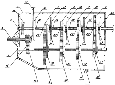 На чертеже изображена схема предлагаемой коробки-автомата, которая состоит из корпуса 1, ведущего вала 4, промежуточного вала 3, ведомого вала 2. На ведущем валу 4 расположены ведущие шестерни 9, 10, 11, 12 соответственно 4-й, 3-й, 2-й, 1-й передач, которые сблокированы с ведомыми шестернями 5, 6, 7, 8 ведомого вала 2 с помощью вилки 30, 31, 32, 33. Ведомый вал содержит шестерню 13, необходимую для передачи вращения от промежуточного вала 3. Ведомый вал содержит также резьбовые зоны 22, 23, 24, 25 соответственно 4-й, 3-й, 2-й, 1-й передачи, а также гладкие зоны 26, 27, 28, 29 и цилиндрические диски 16, 17, 18, 19, 20, ограничивающие участки ведомого вала, соответствующие 4-й, 3-й, 2-й, 1-й передачам, и пружины 21. Ведущий вал 4 содержит шестерню 15, необходимую для передачи вращения от промежуточного вала. Промежуточный вал 3 содержит шестерню 14, необходимую для передачи вращения от промежуточного вала попеременно или на ведущий, или на ведомый вал. Рычаг 34 необходим для перемещения шестерни 14 по промежуточному валу 3. Корпус коробки-автомата содержит маслосливную пробку 34. Отверстие для заливки масла условно не показано. Условно не показан привод спидометра и другие неосновные детали и узлы.