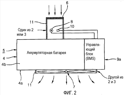 Например, как показано на фиг.1, обычное устройство 1 кондиционирования воздуха для аккумуляторной батареи содержит аккумуляторную 5 батарею, состоящую из нескольких батарей (не показаны), и кожух 4, в котором размещены батареи, так что обеспечивается проход для воздушного потока между соседними батареями, и который имеет впуск 2 воздуха на одной из своих сторон и выпуск 3 воздуха на другой своей стороне; воздушный фильтр 6, съемно установленный вокруг воздушного входа 2; обдувочный вентилятор 7, предусмотренный на выпуске 3 воздуха; датчик 8 температуры, расположенный вокруг воздушного входа и измеряющий тепло, создаваемое аккумуляторной батареей 5; и управляющий блок 9 (такой как BMS), соединенный, соответственно, с батареями аккумуляторной батареи 5, обдувочным вентилятором 7 и датчиком 8 температуры с целью измерения токов, напряжений и температур соответствующих батарей и электрического управления обдувочным вентилятором 7 и датчиком 8 температуры.
